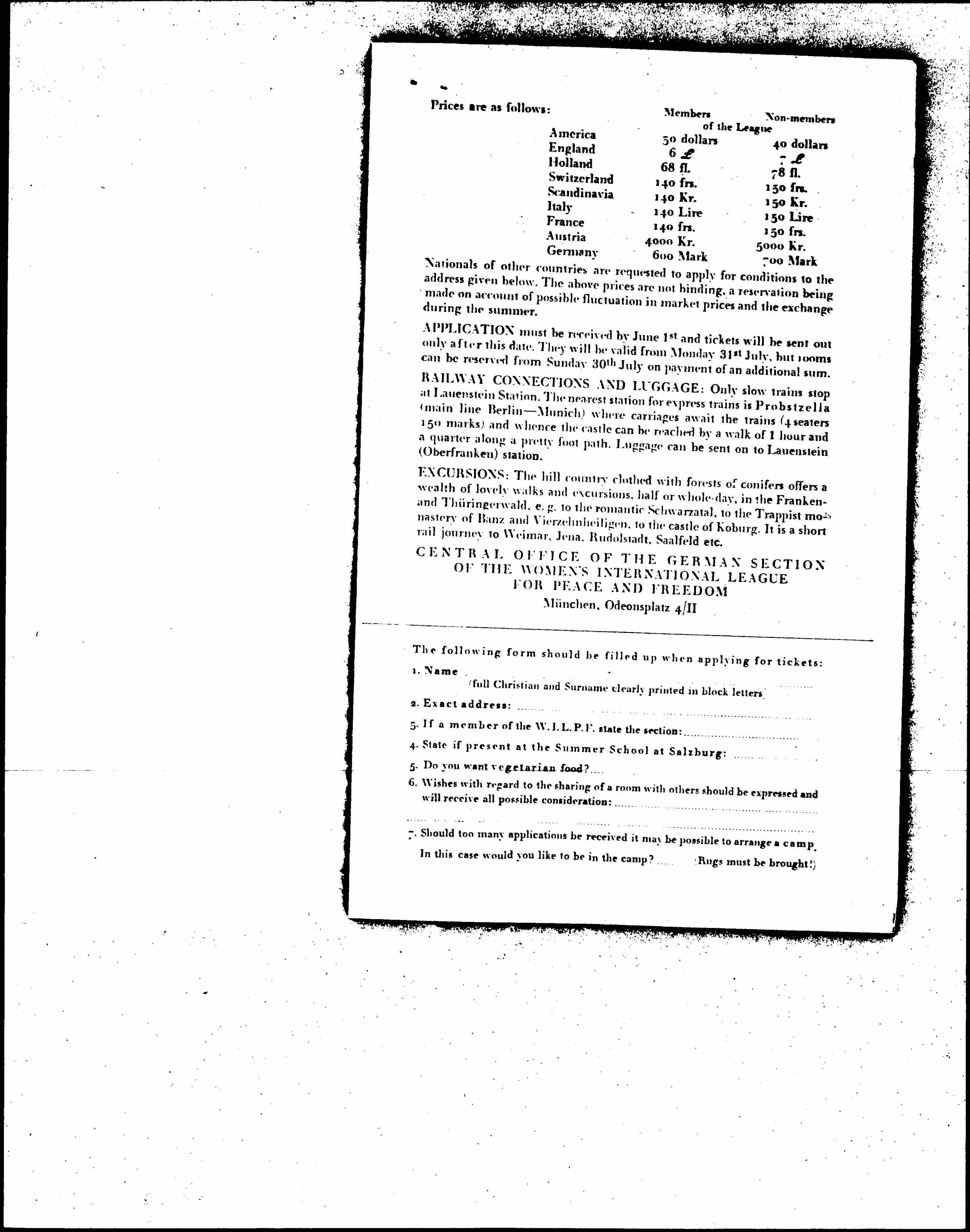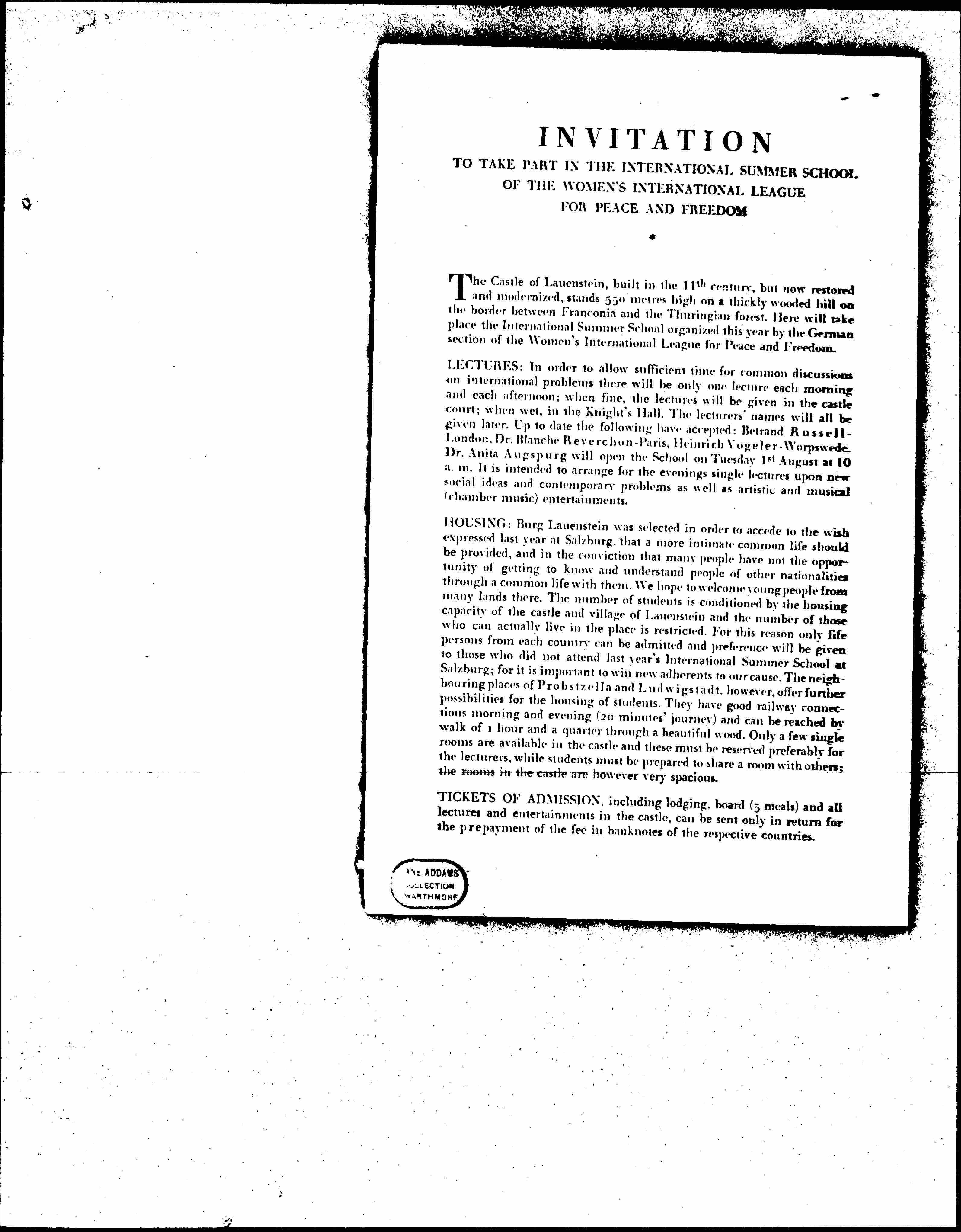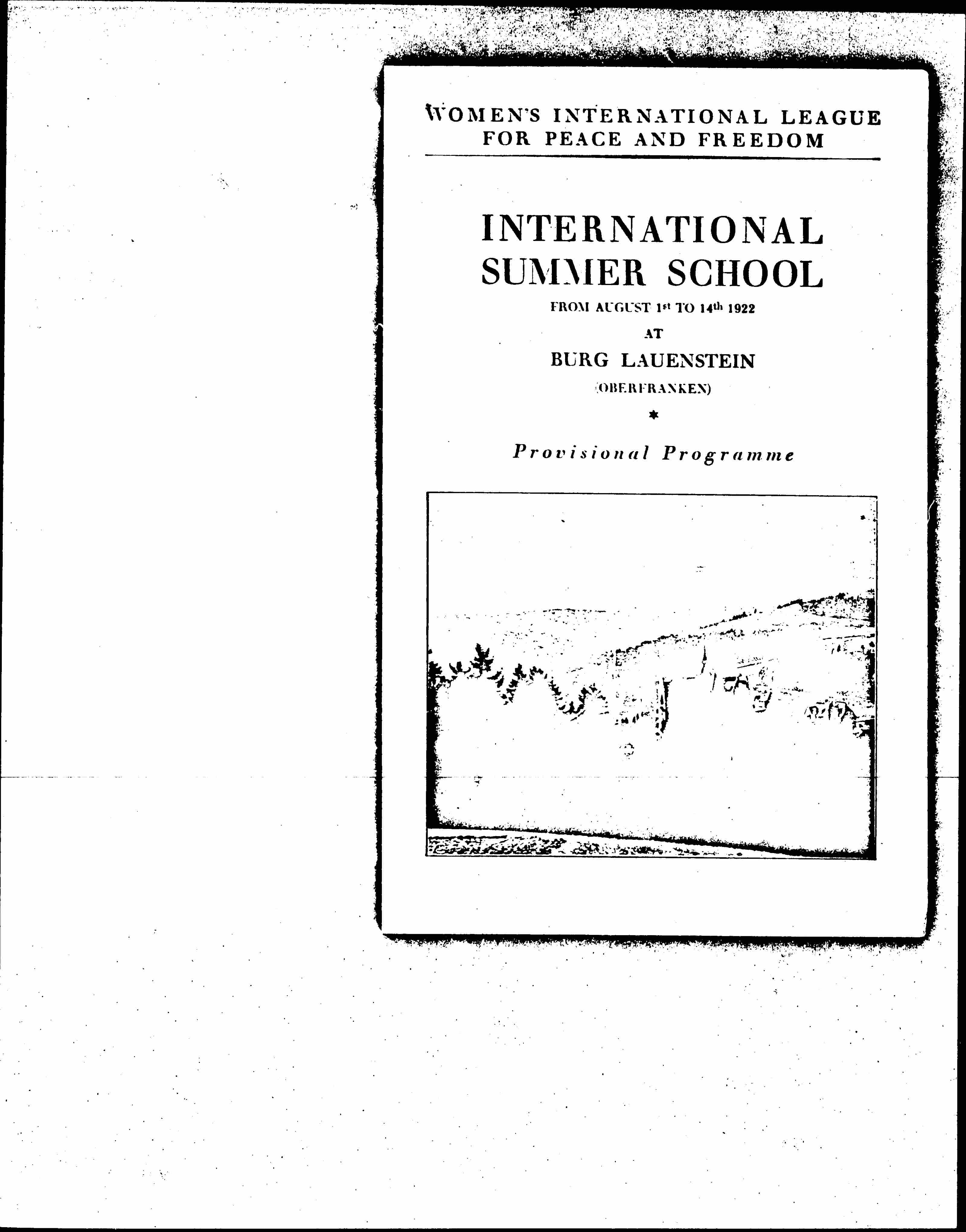 LECTURES: In order to allow sufficient times for common discussions on international problems there will be only one lecture each morning and each afternoon; when fine, the lectures will be given in the castle court; when wet, in the Knight's Hall. The lecturers' names will all be given later. Up to date the following have accepted: Betrand Russell -- London, Dr. Blanche Reverchon -- Paris, Heinrich Vogeler -- Worpswede. Dr. Anita Augspurg will open the School on Tuesday 1st August at 10 a.m. It is intended to arrange for the evenings single lectures upon new social ideas and contemporary problems as well as artistic and musical (chamber music) entertainments.