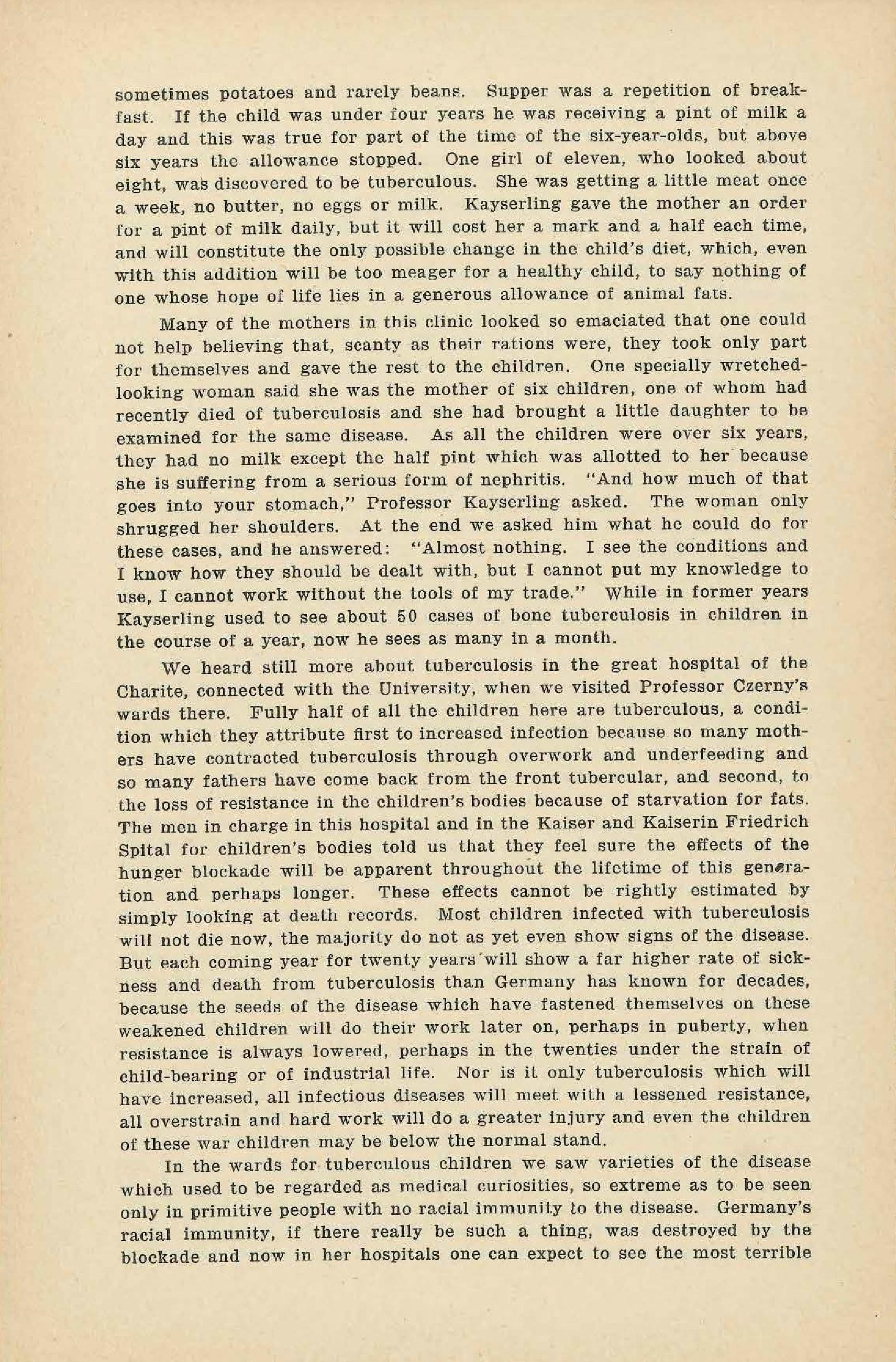 We heard still more about tuberculosis in the great hospital of the Charite, connected with the University, when we visited Professor Czerny's wards there. Fully half of all the children here are tuberculous, a condition which they attribute first to increased infection because so many mothers have contracted tuberculosis through overwork and underfeeding and so many fathers have come back from the front tubercular, and second, to the loss of resistance in the children's bodies because of starvation for fats. The men in charge in this hospital and in the Kaiser and Kaiserin Friedrich Spital for the children's bodies told us that they feel sure the effects of the hunger blockade will be apparent throughout the lifetime of this generation and perhaps longer. These effects cannot be rightly estimated by simply looking at death records. Most children infected with tuberculosis will not die now, the majority do not as yet even show signs of the disease. But each coming year for twenty years will show a far higher rate of sickness and death from tuberculosis than Germany has known for decades, because the seeds of the disease which have fastened themselves on these weakened children will do their work later on, perhaps in puberty, when resistance is always lowered, perhaps in the twenties under the strain of child-bearing or of industrial life. Nor is it only tuberculosis which will have increased, all infectious diseases will meet with a lessened resistance, all overstrain and hard work will do a greater injury and even the children of these war children may be below the normal stand.