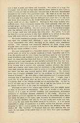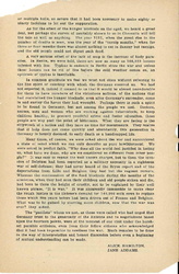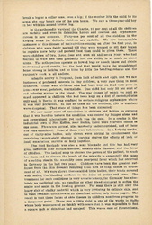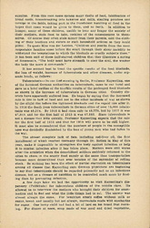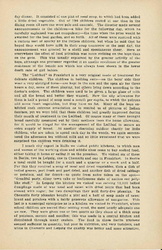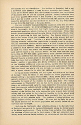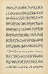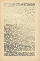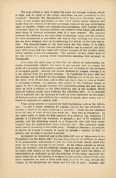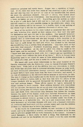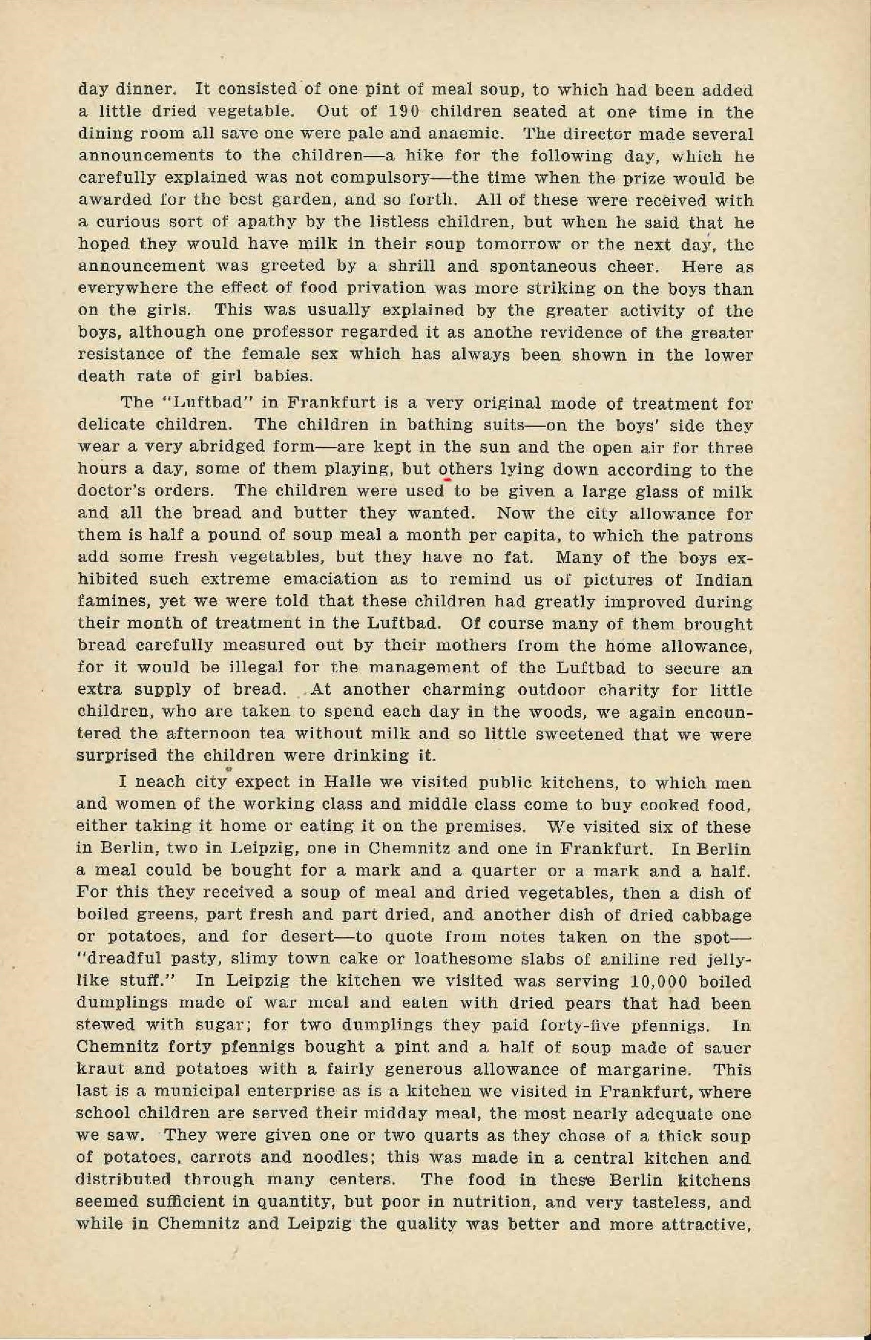 In Leipzig we visited a "Landkolonie," a large playground in which 625 children from 6 to 12 years of age spend the day and are given a mid-day [page 9] dinner. It consisted of one pint of meal soup, to which had been added a little dried vegetable. Out of 190 children seated at one time in the dining room all save one were pale and [anemic]. The director made several announcements to the children -- a hike for the following day, which he carefully explained was not compulsory -- the time when the prize would be awarded for the best garden, and so forth. All of these were received with a curious sort of apathy by the listless children, but when he said that he hoped they would have milk in their soup tomorrow or the next day, the announcement was greeted by a shrill and spontaneous cheer. Here as everywhere the effect of food privation was more striking on the boys than on the girls. This was usually explained by the greater activity of the boys, although one professor regarded it as another evidence of the greater resistance of the female sex which has always been shown in the lower death rate of girl babies.