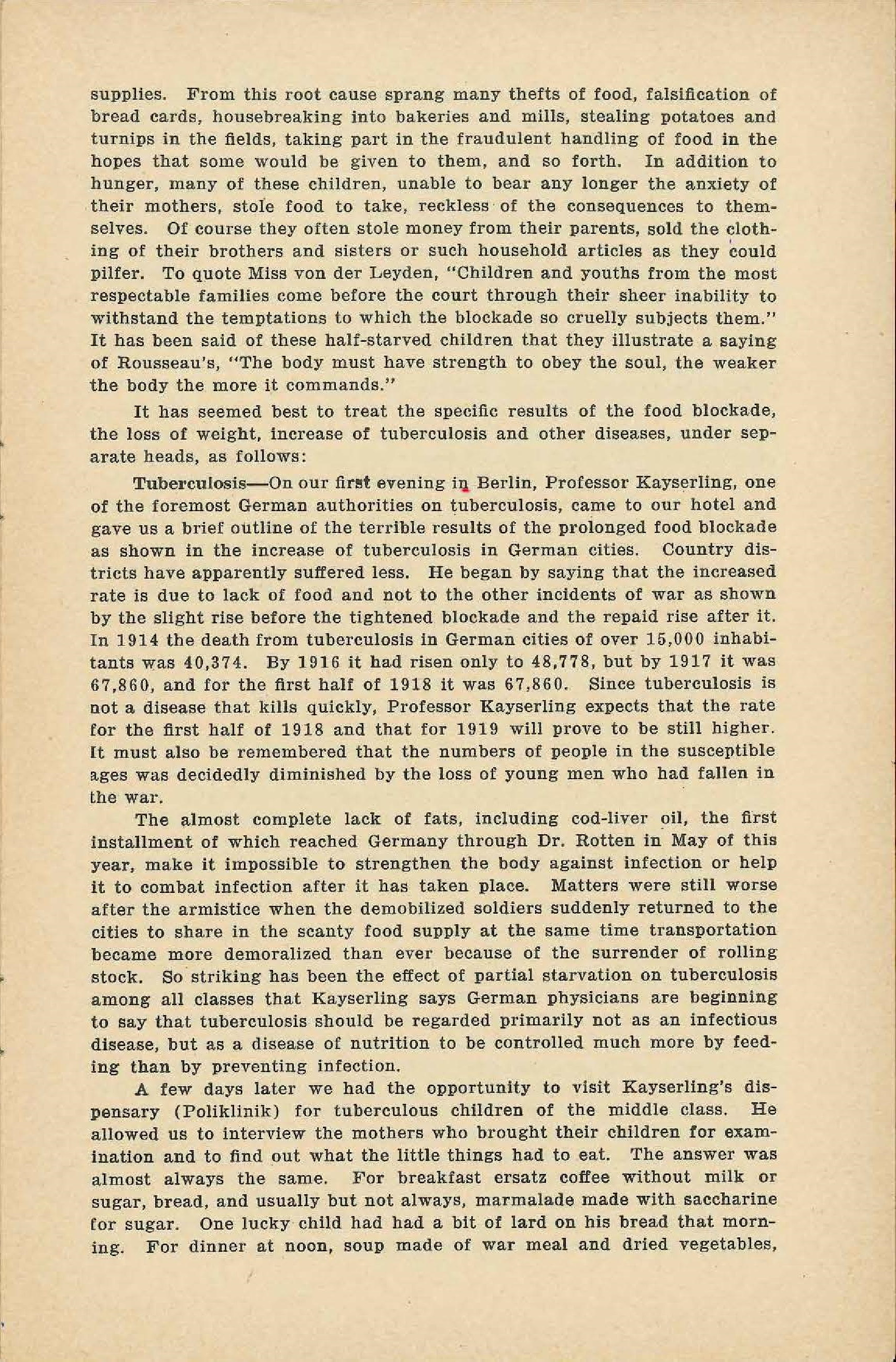 A few days later we had the opportunity to visit Kayserling's dispensary (Poliklinik) for tuberculous children of the middle class. He allowed us to interview the mothers who brought their children for examination and to find out what the little things had to eat. The answer was almost always the same. For breakfast ersatz coffee without milk or sugar, bread, and usually but not always, marmalade made with [saccharin] for sugar. One lucky child had had a bit of lard on his bread that morning. For dinner at noon, soup made of war meal and dried vegetables, [page 12] sometimes potatoes and rarely beans. Supper was a repetition of breakfast. If a child was under four years he was receiving a pint of milk a day and this was true for part of the time of the six-year-olds, but above six years the allowance stopped. One girl of eleven, who looked about eight, was discovered to be tuberculous. She was getting a little meat once a week, no butter, no eggs or milk. Kayserling gave the mother an order for a pint of milk daily, but it will cost her a mark and a half each time, and will constitute the only possible change in the child's diet, which, even with this addition will be too meager for a healthy child, to say nothing of one whose hope of life lies in a generous allowance of animal fats.