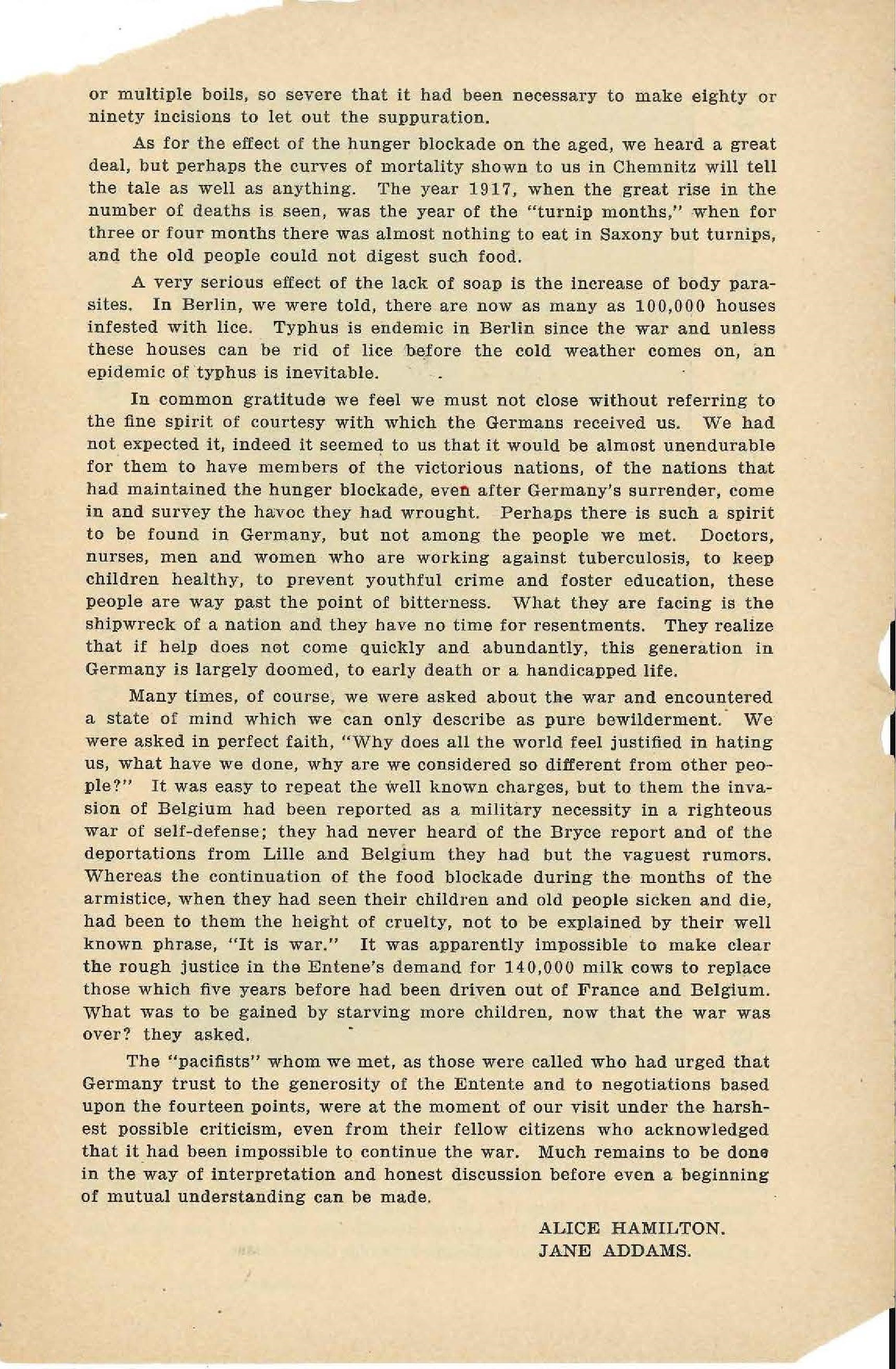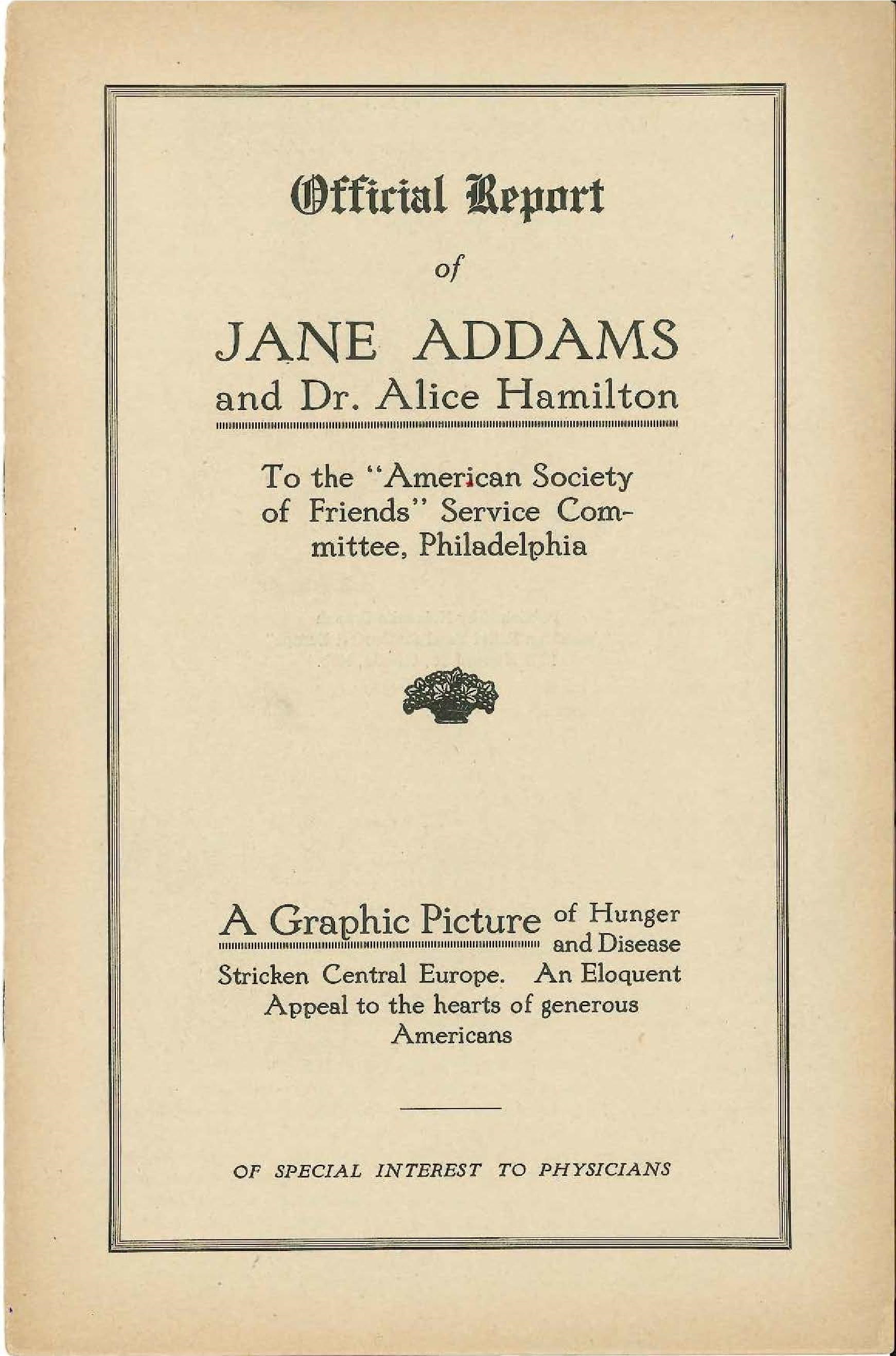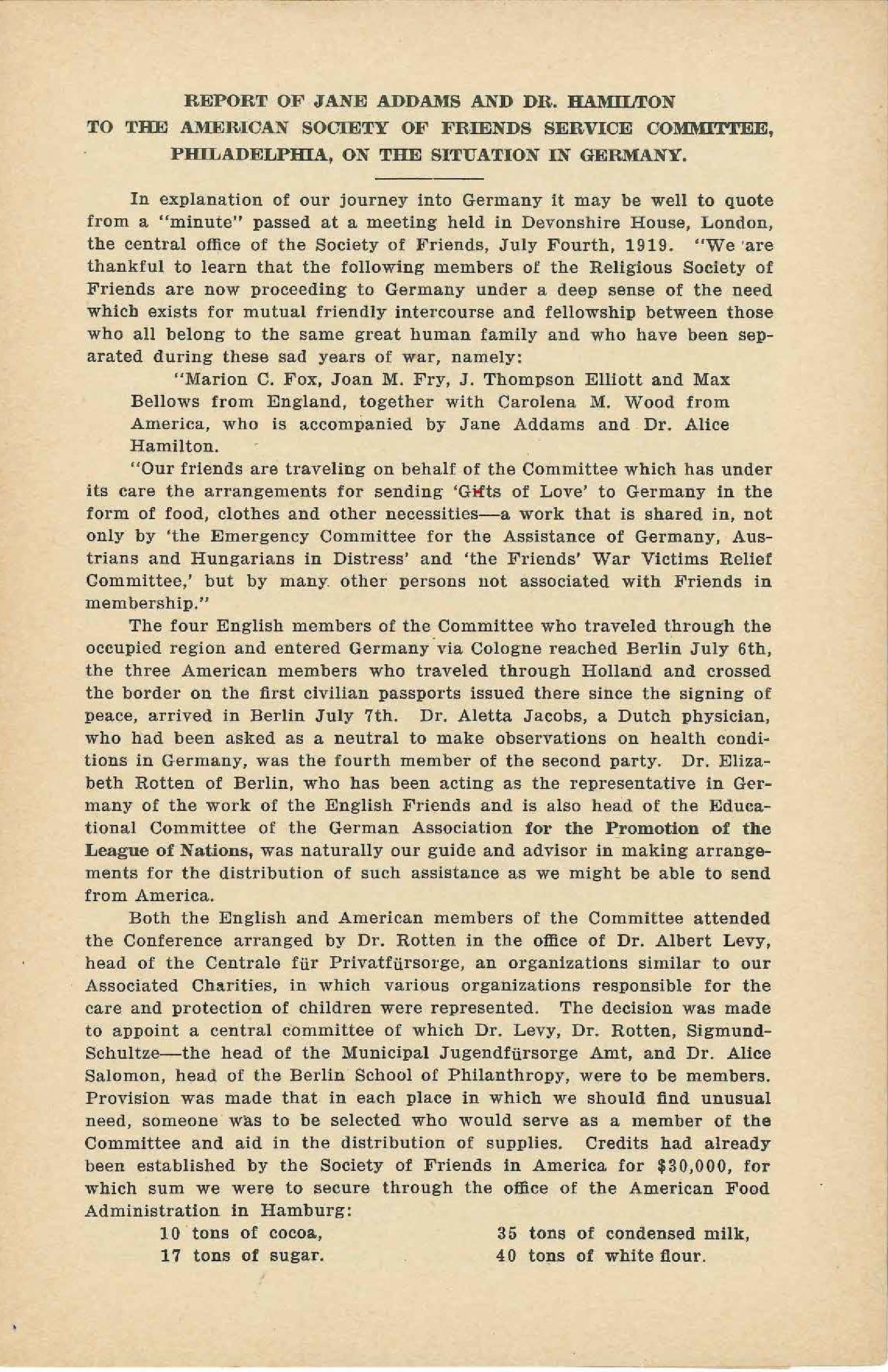 REPORT OF JANE ADDAMS AND DR. HAMILTON TO THE AMERICAN SOCIETY OF FRIENDS SERVICE COMMITTEE, PHILADELPHIA, ON THE SITUATION IN GERMANY.