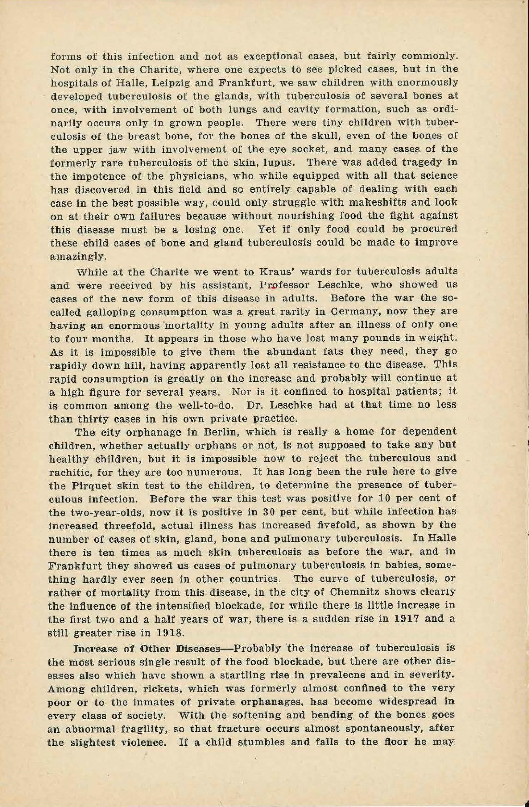 The city orphanage in Berlin, which is really a home for dependent children, whether actually orphans or not, is not supposed to take any but healthy children, but it is impossible now to reject the tuberculous and rachitic, for they are too numerous. It has long been the rule here to give the Pirquet skin test to the children, to determine the presence of tuberculous infection. Before the war this test was positive for 10 [percent] of the two-year-olds, now it is positive in 30 [percent], but while infection has increased threefold, actual illness has increased fivefold, as shown by the number of cases of skin, gland, bone and pulmonary tuberculosis. In Halle there is ten times as much skin tuberculosis as before the war, and in Frankfurt they showed us cases of pulmonary tuberculosis in babies, something hardly ever seen in other countries. The curve of tuberculosis, or rather of mortality from this disease, in the city of Chemnitz shows clearly the influence of the intensified blockade, for while there is little increase in the first two and a half years of war, there is a sudden rise in 1917 and a still greater rise in 1918.