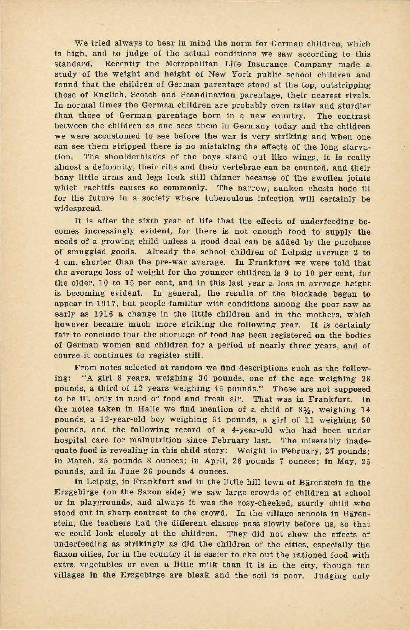 We tried always to bear in mind the norm for German children, which is high, and to judge of the actual conditions we saw according to this standard. Recently the Metropolitan Life Insurance Company made a study of the weight and height of New York public school children and found that the children of German parentage stood at the top, outstripping those of English, Scotch and Scandinavian parentage, their nearest rivals. In normal times the German children are properly even taller and sturdier than those of German parentage born in a new country. The contrast between the children as one sees them in Germany today and the children we were accustomed to see before the war is very striking and when one can see them stripped there is no mistaking the effects of the long starvation. The [shoulder blades] of the boys stand out like wings, it is really almost a deformity, their ribs and their vertebrae can be counted, and their bony little arms and legs look still thinner because of the swollen joints which [rickets] causes so commonly. The narrow, sunken chests bode ill for the future in a society where tuberculous infection will certainly be widespread.