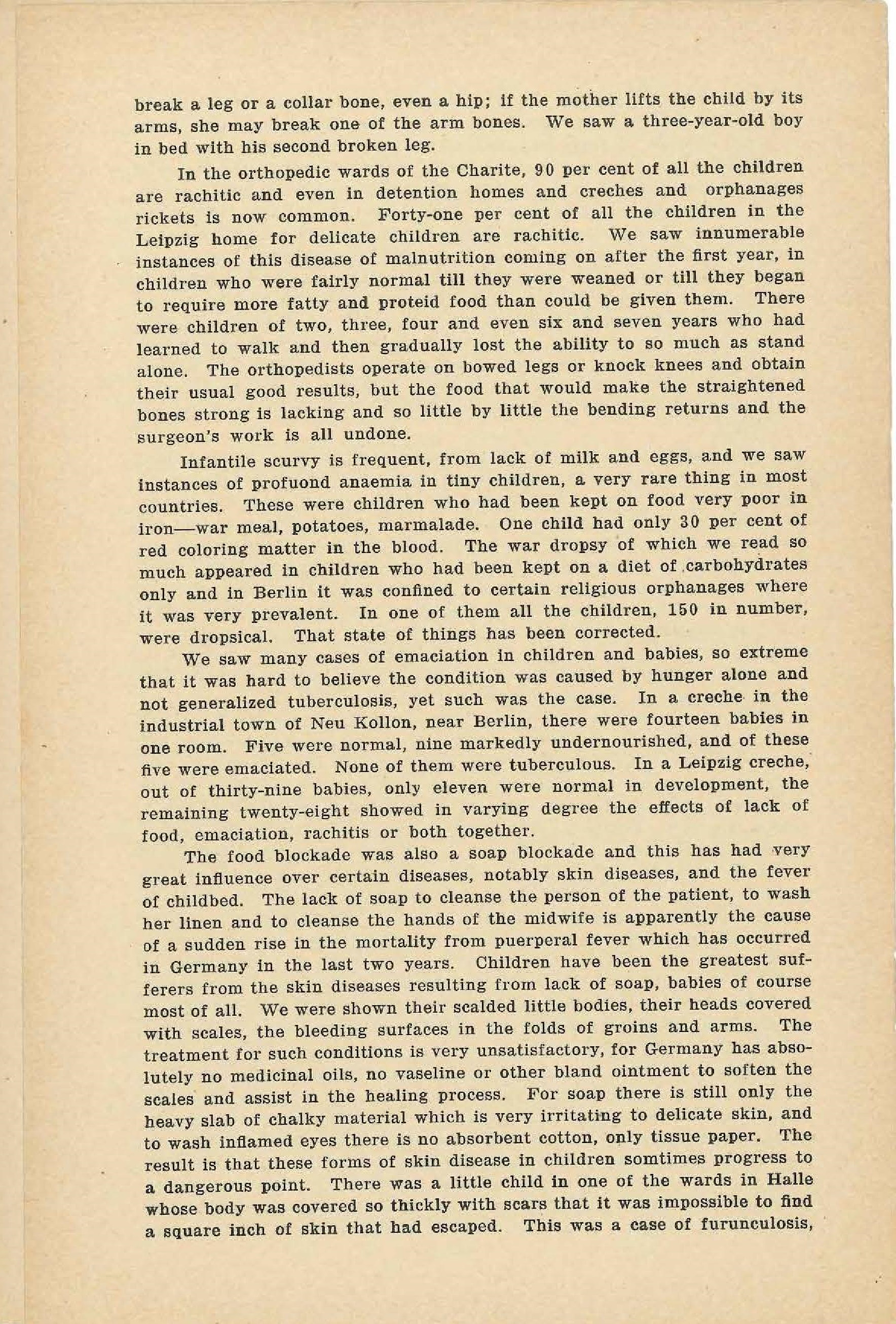 The food blockade was also a soap blockade and this has had very great influence over certain diseases, notably skin diseases, and the fever of childbed. The lack of soap to cleanse the person of the patient, to wash her linen and to cleanse the hands of the midwife is apparently the cause of a sudden rise in the mortality from puerperal fever which has occurred in Germany in the last two years. Children have been the greatest sufferers from the skin diseases resulting from lack of soap, babies of course most of all. We were shown their scalded little bodies, their heads covered with scales, the bleeding surfaces in the folds of groins and arms. The treatment for such conditions is very unsatisfactory, for Germany has absolutely no medicinal oils, no vaseline or other bland ointment to soften the scales and assist in the healing process. For soap there is still only the heavy slab of chalky material which is very irritating to delicate skin, and to wash inflamed eyes there is no absorbent cotton, only tissue paper. The result is that these forms of skin disease in children sometimes progress to a dangerous point. There was a little child in one of the wards in Halle whose body was covered so thickly with scars that it was impossible to find a square inch of skin that had escaped. This was a case of furunculosis, [page 15] or multiple boils, so severe that it had been necessary to make eighty or ninety incisions to let out the suppuration.