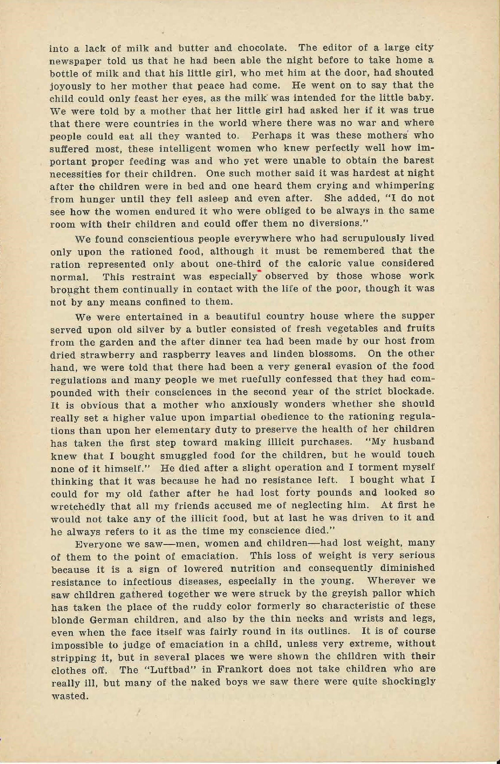 Everyone we saw -- men, women and children -- had lost weight, many of them to the point of emaciation. This loss of weight is very serious because it is a sign of lowered nutrition and consequently diminished resistance to infectious diseases, especially in the young. Wherever we saw children gathered together we were struck by the greyish pallor which has taken the place of the ruddy color formerly so characteristic of these blonde German children, and also by the thin necks and wrists and legs, even when the face itself was fairly round in its outlines. It is of course impossible to judge of emaciation in a child, unless very extreme, without stripping it, but in several places we were shown the children with their clothes off. The "Luftbad" in Frankfort does not take children who are really ill, but many of the naked boys we saw there were quite shockingly wasted. [page 6]