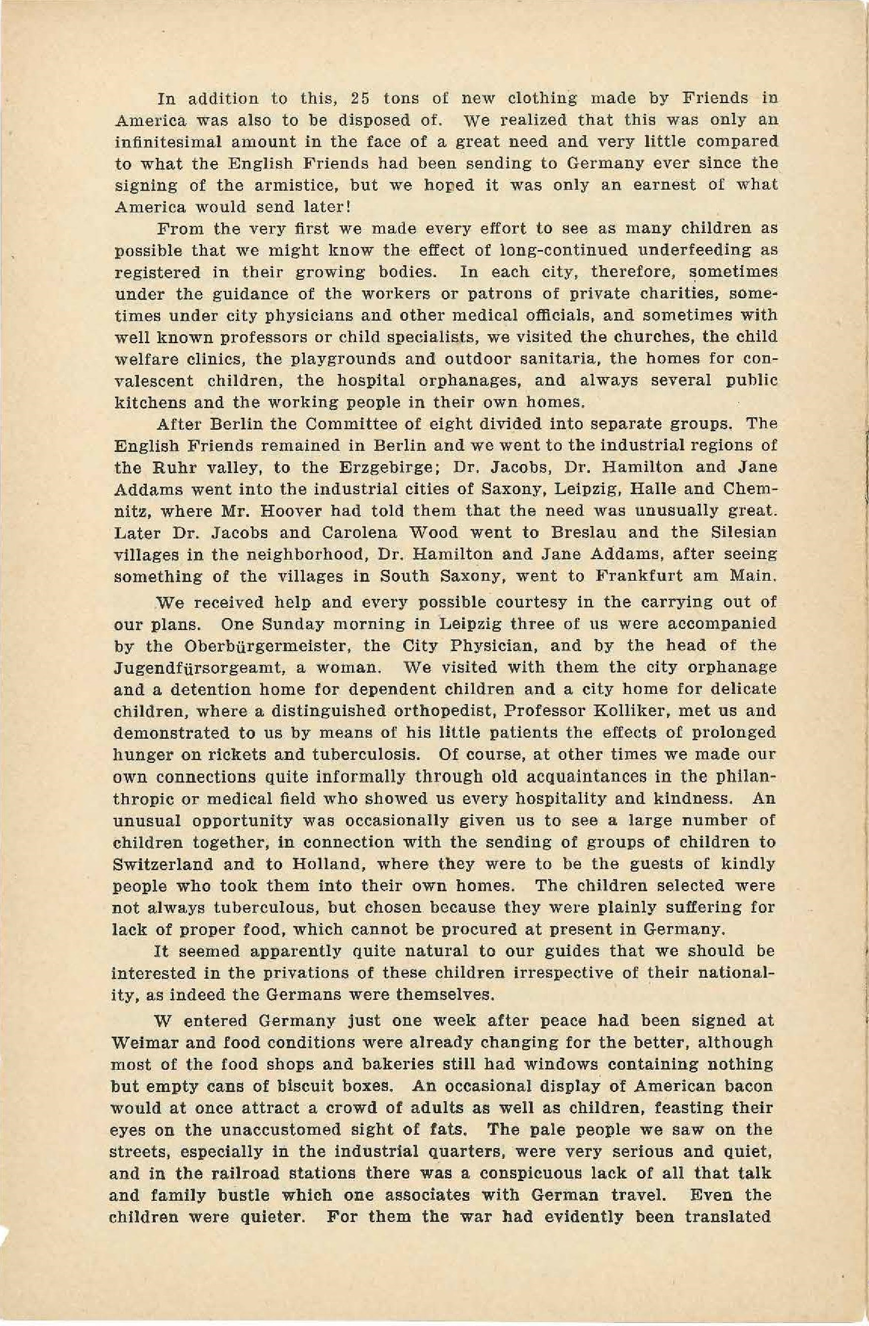 After Berlin the Committee of eight divided into separate groups. The English Friends remained in Berlin and we went to the industrial regions of the Ruhr valley, to the Erzgebirge; Dr. Jacobs, Dr. Hamilton and Jane Addams went into the industrial cities of Saxony, Leipzig, Halle and Chemnitz, where Mr. Hoover had told them that the need was unusually great. Later Dr. Jacobs and Carolena Wood went to Breslau and the Silesian villages in the neighborhood, Dr. Hamilton and Jane Addams, after seeing something of the villages in South Saxony, went to Frankfurt am Main.