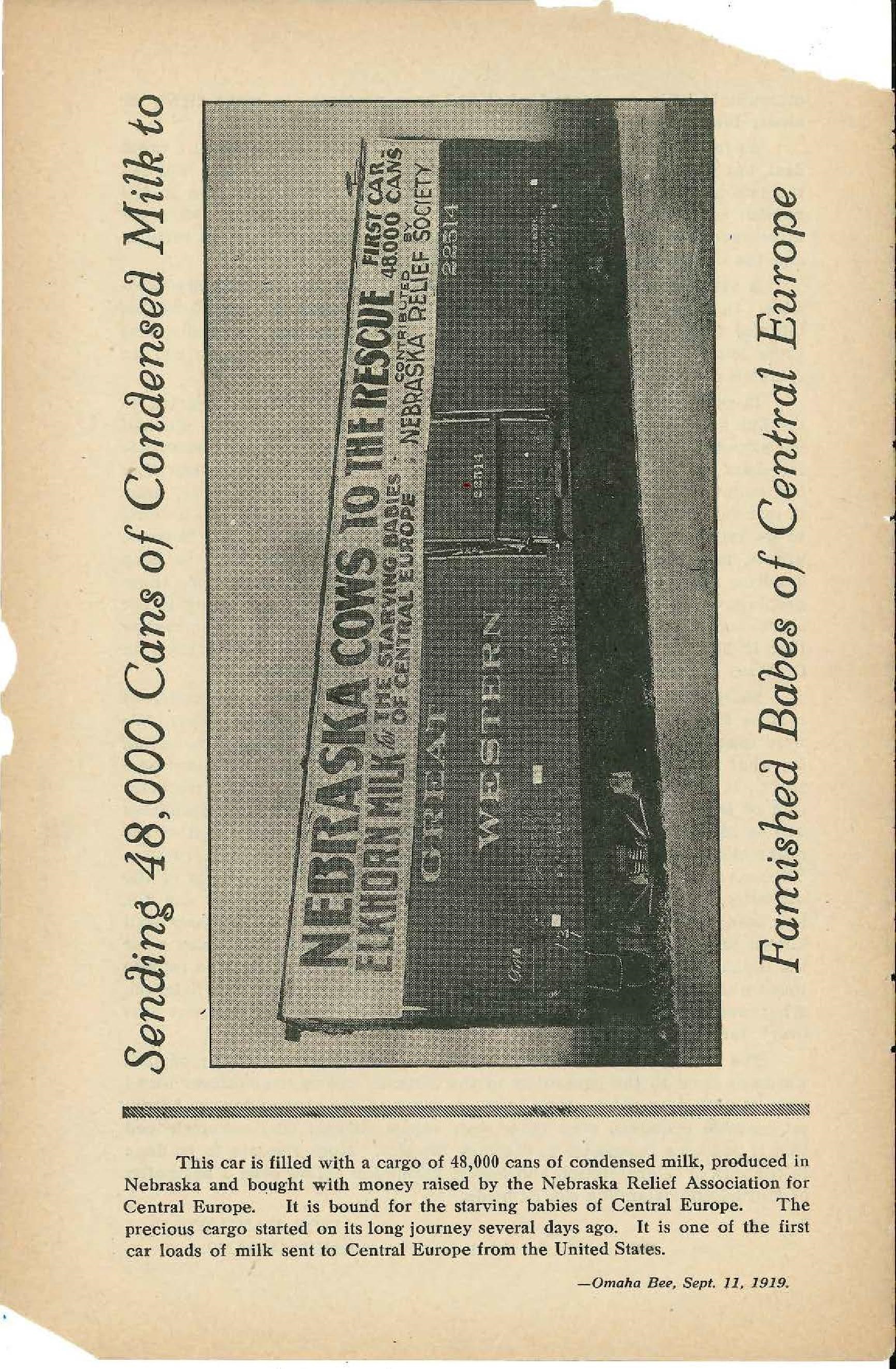 This car is filled with a cargo of 48,000 cans of condensed milk, produced in Nebraska and bought with money raised by the Nebraska Relief Association for Central Europe. It is bound for the starving babies of Central Europe. The precious cargo started on its long journey several days ago. It is one of the first car loads of milk sent to Central Europe from the United States.