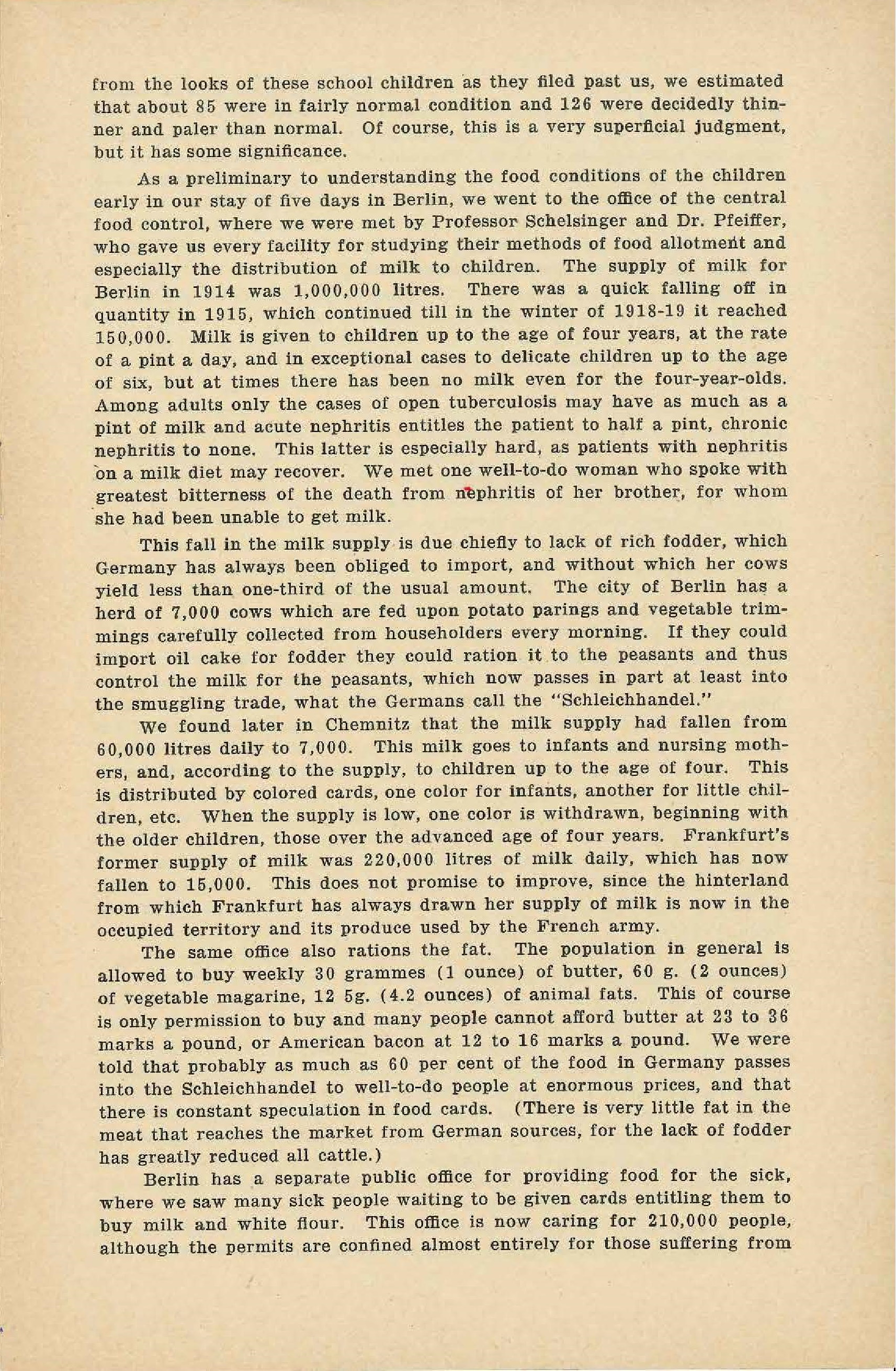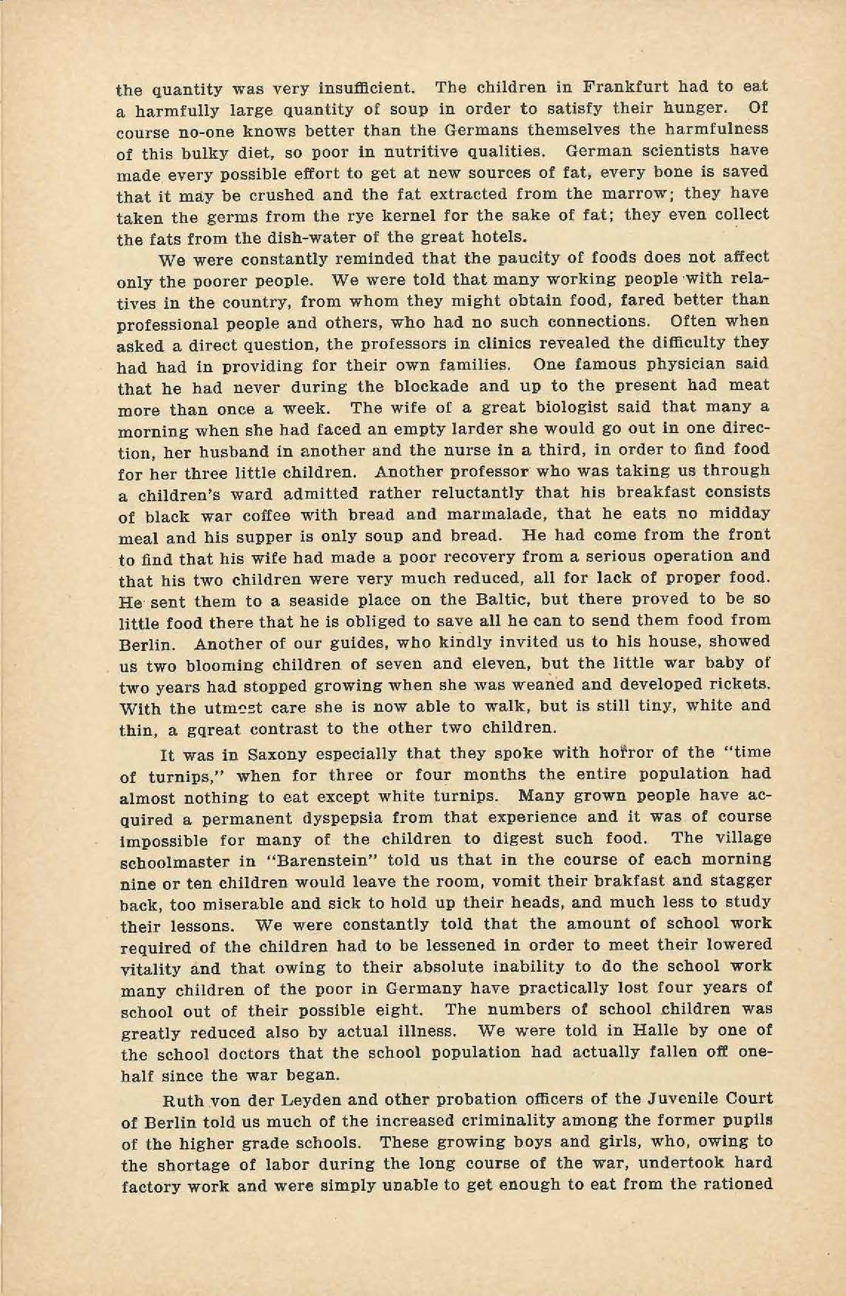 In each city except in Halle we visited public kitchens, to which men and women of the working class and middle class come to buy cooked food, either taking it home or eating it on the premises. We visited six of these in Berlin, two in Leipzig, one in Chemnitz and one in Frankfurt. In Berlin a meal could be bought for a mark and a quarter or a mark and a half. For this they received a soup of meal and dried vegetables, then a dish of boiled greens, part fresh and part dried, and another dish of dried cabbage or potatoes, and for [dessert] -- to quote from notes taken on the spot -- "dreadful pasty, slimy town cake or [loathsome] slabs of aniline red jelly-like stuff." In Leipzig the kitchen we visited was serving 10,000 boiled dumplings made of war meal and eaten with dried pears that had been stewed with sugar; for two dumplings they paid forty-five pfennigs. In Chemnitz forty pfennigs bought a pint and a half of soup made of [sauerkraut] and potatoes with a fairly generous allowance of margarine. This last is a municipal enterprise as is a kitchen we visited in Frankfurt, where school children are served their midday meal, the most nearly adequate one we saw. They were given one or two quarts as they chose of a thick soup of potatoes, carrots and noodles; this was made in a central kitchen and distributed through many centers. The food in these Berlin kitchens seemed sufficient in quantity, but poor in nutrition, and very tasteless, and while in Chemnitz and Leipzig the quality was better and more attractive, [page 10] the quantity was very insufficient. The children in Frankfurt had to eat a harmfully large quantity of soup in order to satisfy their hunger. Of course [no one] knows better than the Germans themselves the harmfulness of this bulky diet, so poor in nutritive qualities. German scientists have made every possible effort to get at new sources of fat, every bone is saved that it may be crushed and the fat extracted from the marrow; they have taken the germs from the rye kernel for the sake of fat; they even collect the fats from the dish-water of the great hotels.