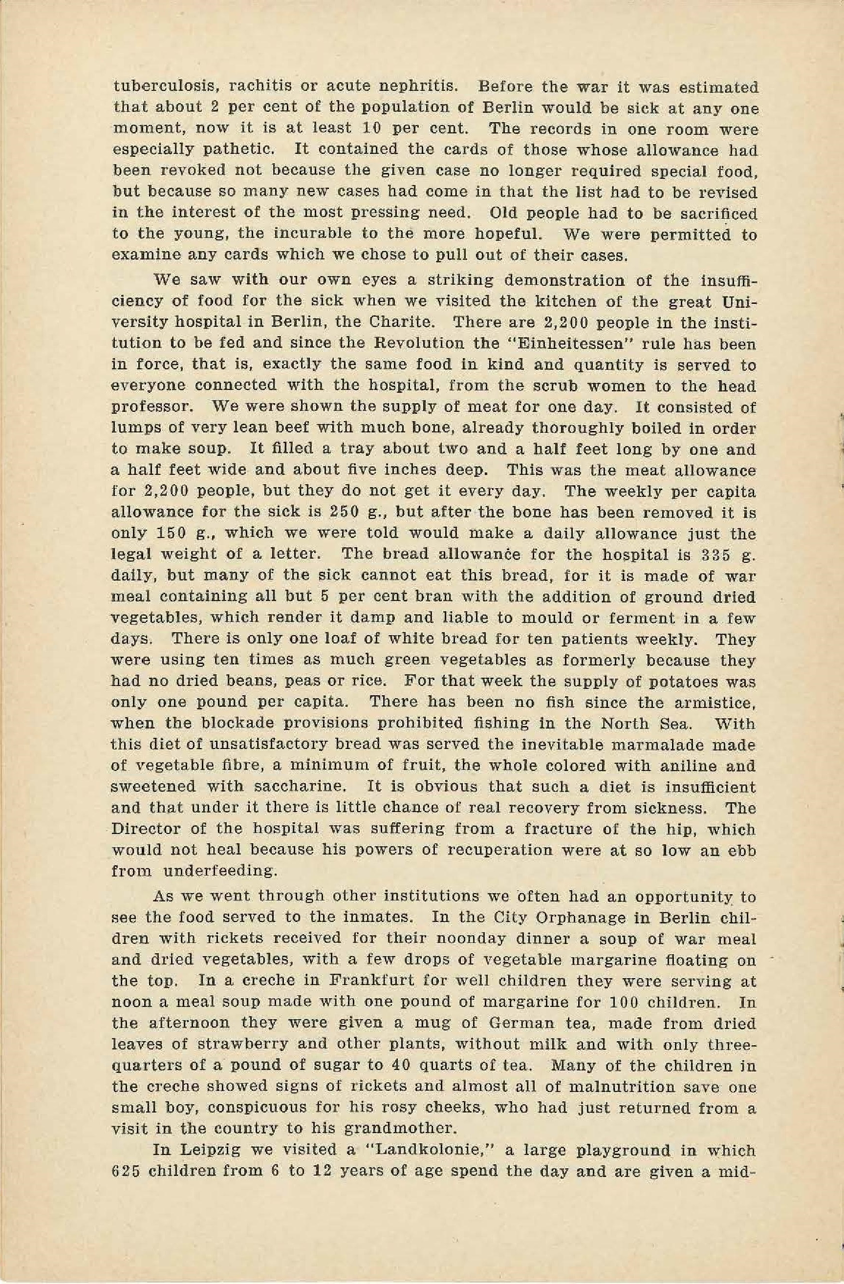 We saw with our own eyes a striking demonstration of the insufficiency of food for the sick when we visited the kitchen of the great University hospital in Berlin, the Charite. There are 2,200 people in the institution to be fed and since the Revolution the "Einheitessen" rule has been in force, that is, exactly the same food in kind and quantity is served to everyone connected with the hospital, from the scrub women to the head professor. We were shown the supply of meat for one day. It consisted of lumps of very lean beef with much bone, already thoroughly boiled in order to make soup. It filled a tray about two and a half feet long by one and a half feet wide and about five inches deep. This was the meet allowance for 2,200 people, but they do not get it every day. The weekly per capita allowance for the sick is 250 g., but after the bone has been removed it is only 150 g., which we were told would make a daily allowance just the legal weight of a letter. The bread allowance for the hospital is 335 g. daily, but many of the sick cannot eat this bread, for it is made of war meal containing all but 5 [percent] bran with the addition of ground dried vegetables, which render it damp and liable to [mold] or ferment in a few days. There is only one loaf of white bread for ten patients weekly. They were using ten times as much green vegetables as formerly because they had no dried beans, peas or rice. For that week the supply of potatoes was only one pound per capita. There has been no fish since the armistice, when the blockade provisions prohibited fishing in the North Sea. With this diet of unsatisfactory bread was served the inevitable marmalade made of vegetable [fiber], a minimum of fruit, the whole colored with aniline and sweetened with saccharine. It is obvious that such a diet is insufficient and that under it there is little chance of real recovery from sickness. The Director of the hospital was suffering from a fracture of the hip, which would not heal because his powers of recuperation were at so low an ebb from underfeeding.