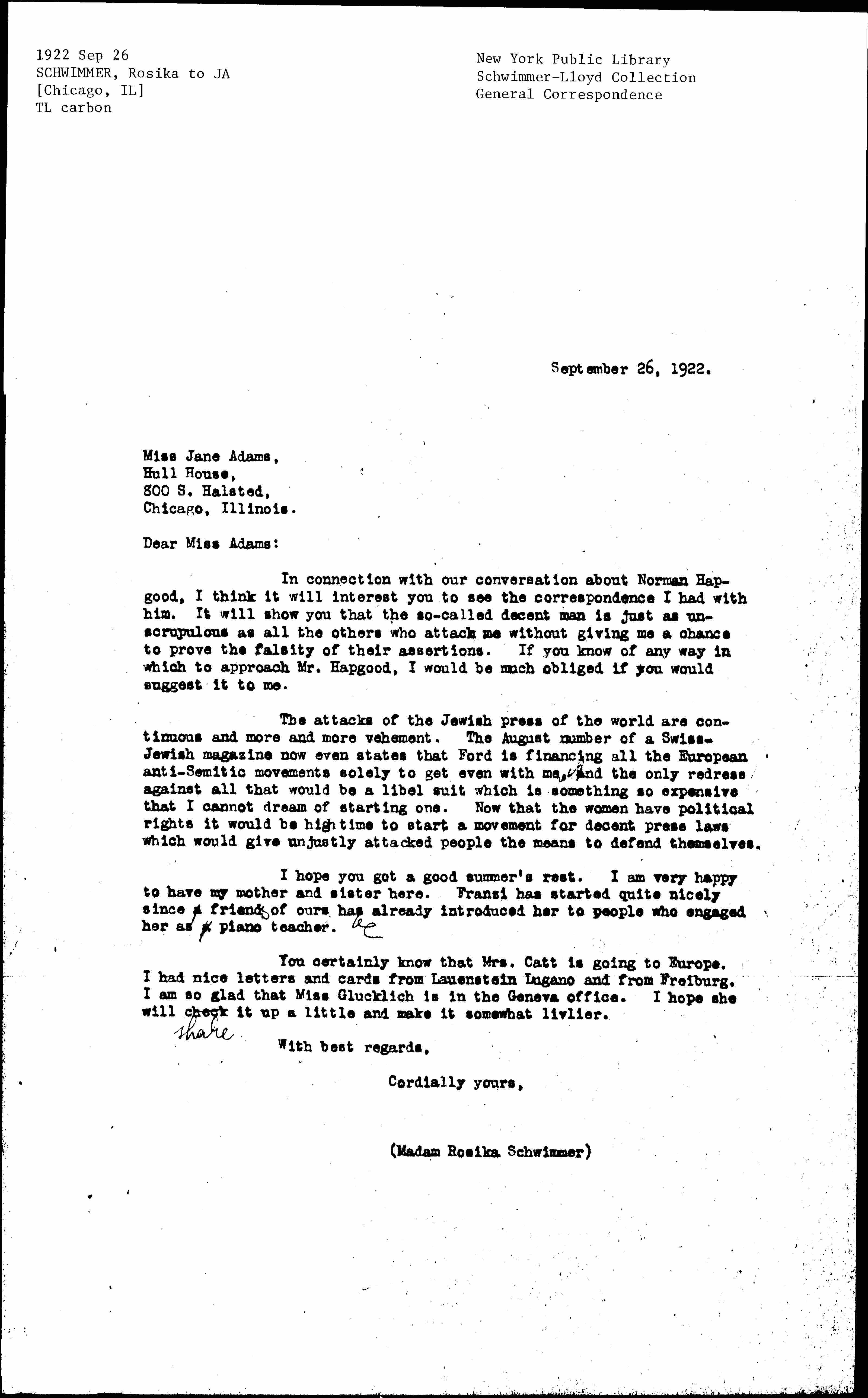 The attacks of the Jewish press of the world are continuous and more and more vehement. The August number of a Swiss-Jewish magazine now even states that Ford is financing all the European anti-Semitic movements solely to get even with me. And the only redress against all that would be a libel suit which is something so expensive that I cannot dream of starting one. Now that the women have political rights it would be high time to start a movement for decent press laws which would give unjustly attacked people the means to defend themselves.
