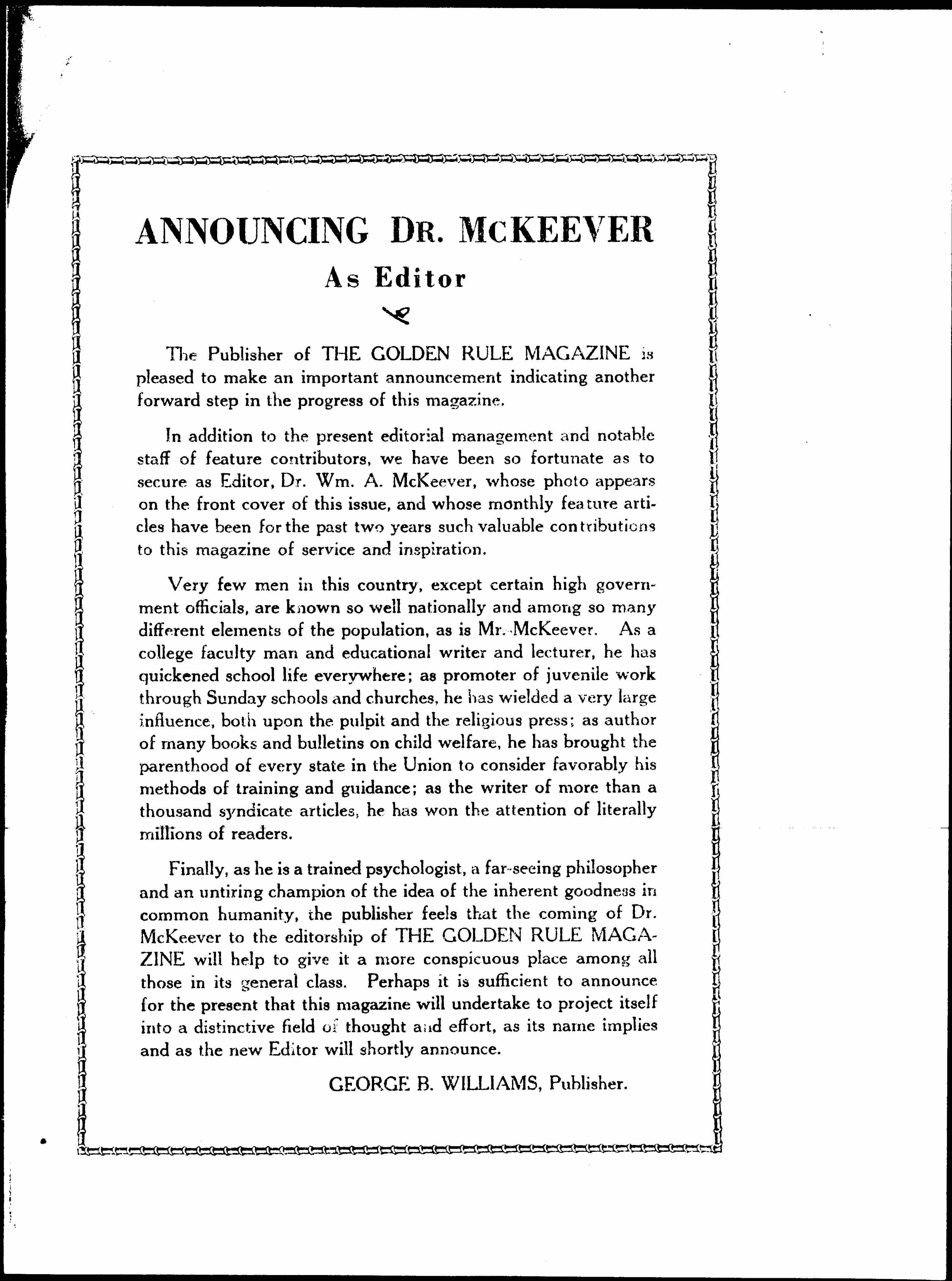 Finally, as he is a trained psychologist, a far-seeing philosopher and an untiring champion of the idea of the inherent goodness in common humanity, the publisher feels that the coming of Dr. McKeever to the editorship of THE GOLDEN RULE MAGAZINE will help to give it a more conspicuous place among all those in its general class. Perhaps it is sufficient to announce for the present that this magazine will undertake to project itself into a distinctive field of thought and effort, as its name implies and as the new Editor will shortly announce.