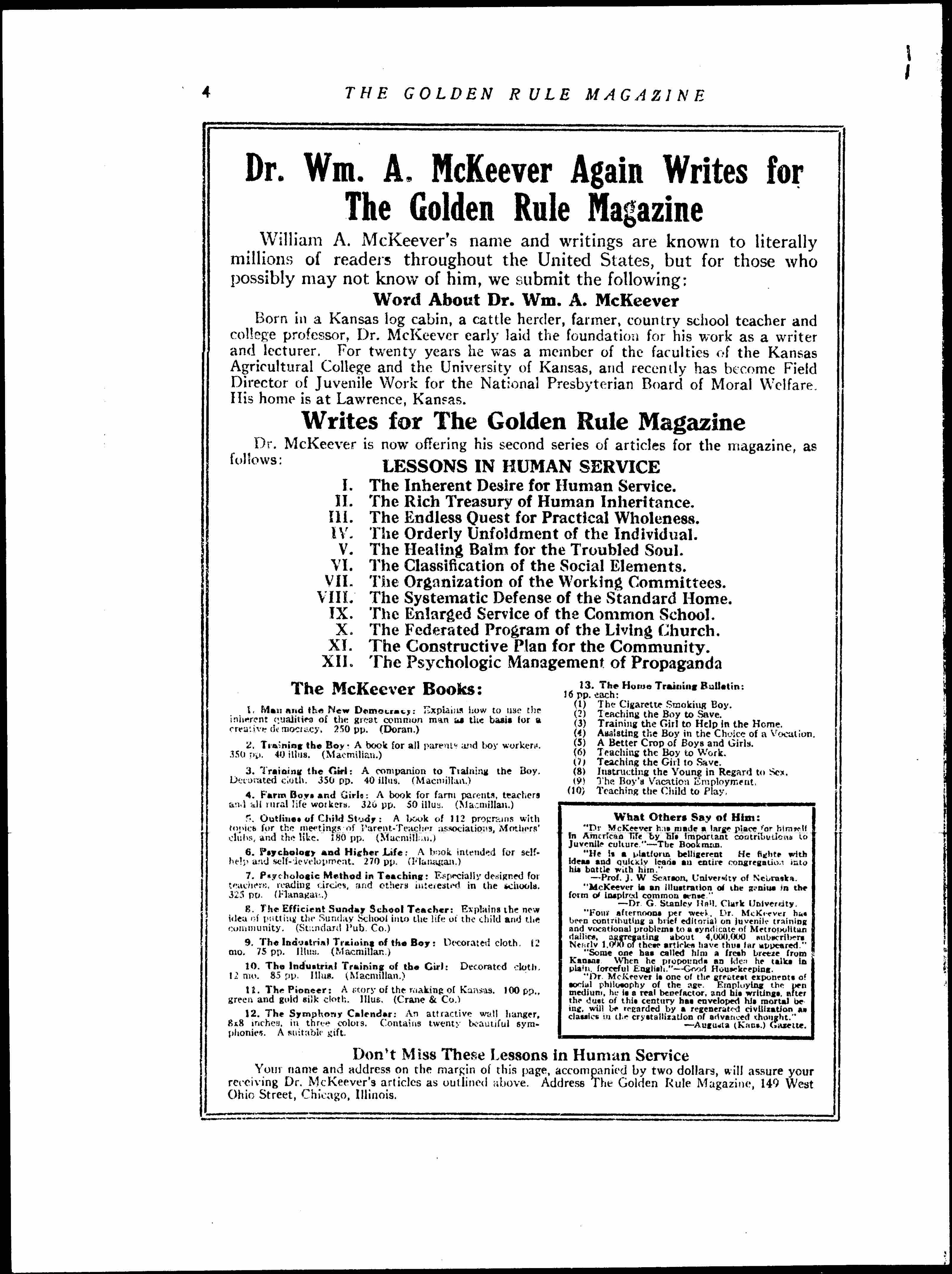 Dr. Wm. A. McKeever Again Writes for The Golden Rule Magazine