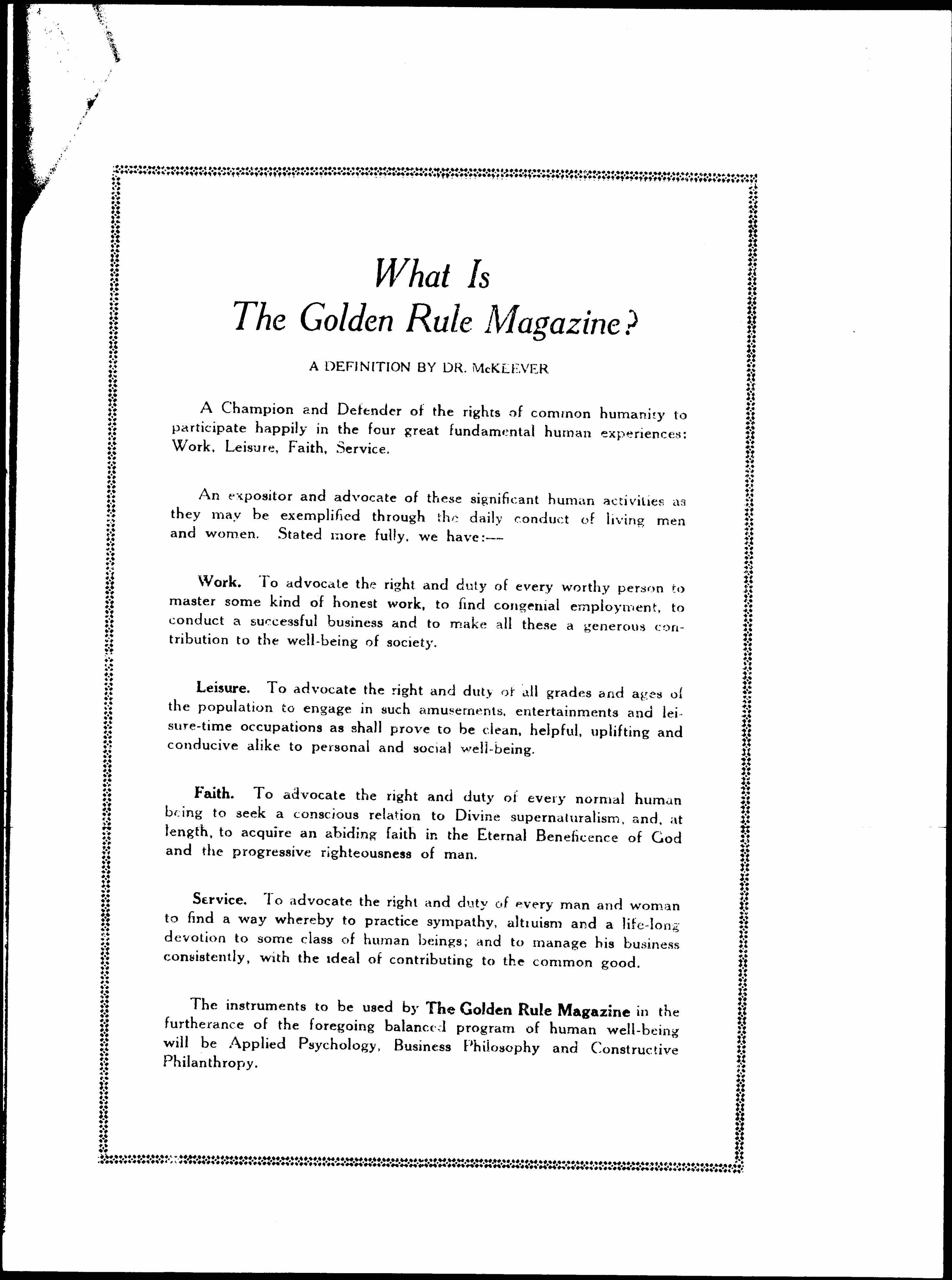 The instruments to be used by The Golden Rule Magazine in the furtherance of the foregoing balanced program of human well-being will be Applied Psychology, Business Philosophy and Constructive Philanthropy. [page 2]