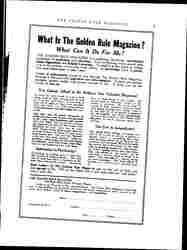 One idea may be worth thousands of dollars to you -- may be your turning point in life -- may mean happiness and success! And this "idea" may be hidden between the pages of any issue of The Golden Rule Magazine -- in fact, there are so many ideas hidden within these pages that one or more of them are bound to mean something big for you. The man who "knows" is the man who really "grows." Ideas are priceless. Ideas make men rich and happy and famous. And The Golden Rule Magazine is just brimming over with ideas.