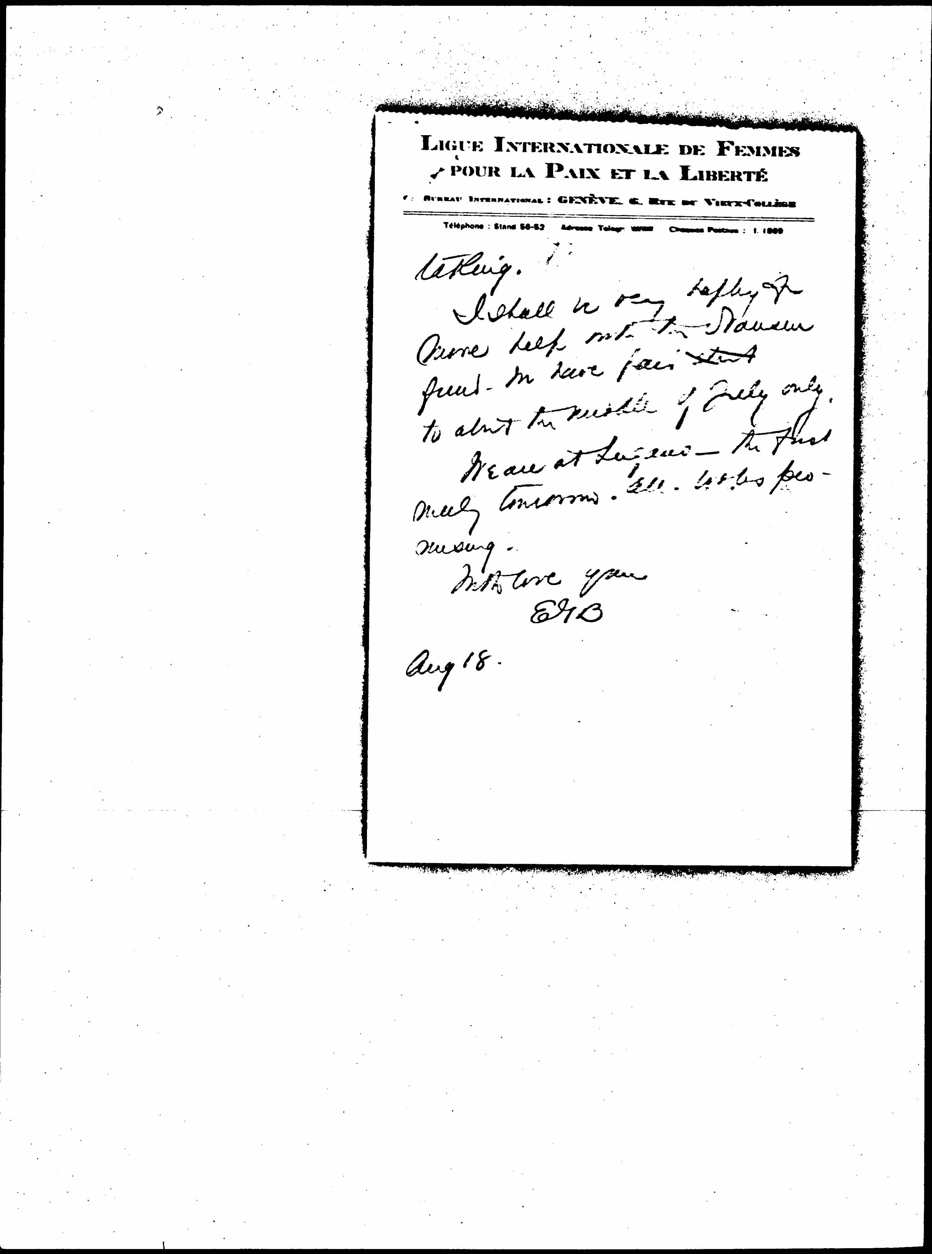Will you cable a receipt of this (address [WILPF] Geneva as usual) just what [the] earliest [page 5] feasible date would be. Perhaps you would wish to add the earliest date you would prefer.