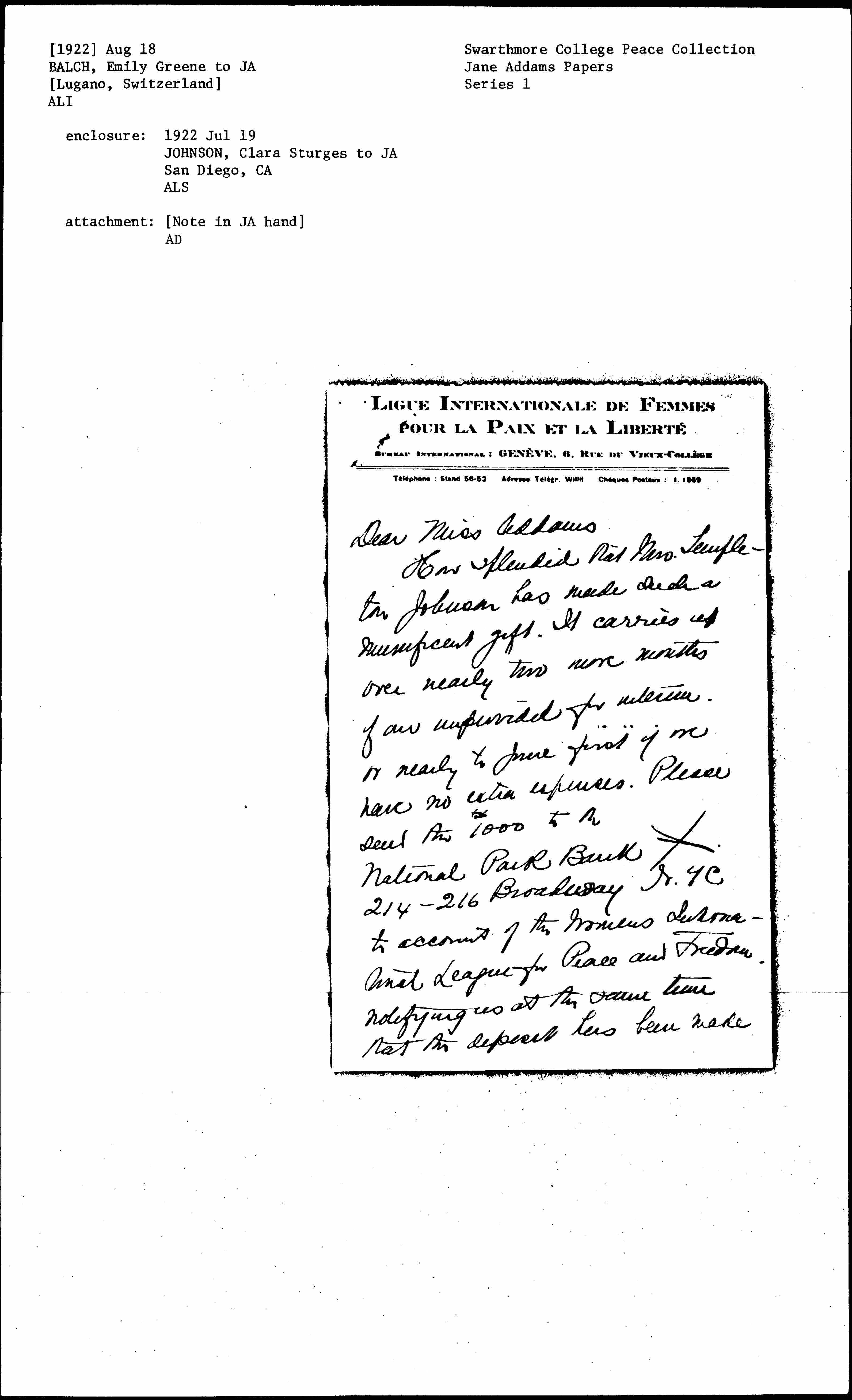 How splendid that Mrs. Templeton Johnson has made such a munificent gift. It carries us over nearly two more months of our unprovided for interim or nearly to June first if we have no extra expenses. Please send the $1000 to the National Park Bank 214-216 Broadway N.Y.C. to account of the Womens International League for Peace and Freedom, notifying us at the same time that the deposit has been made. [page 2]