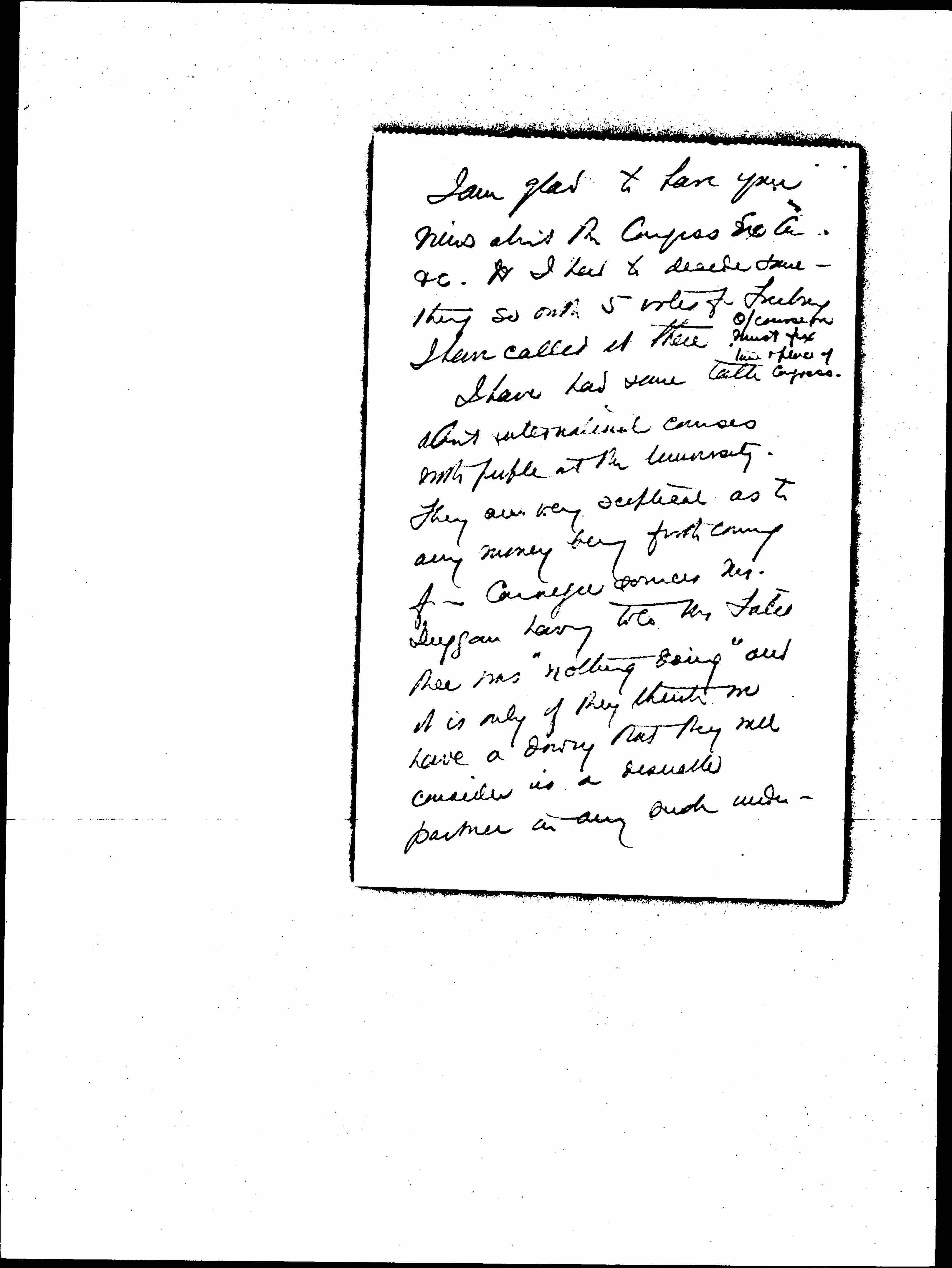 I have had some talk about international causes with people at the University. They are very [skeptical] as to any money being forthcoming from Carnegie sources Mr. Duggan having told Mr [Fatio] there was "nothing doing" and it is only if they think we have a dowry that they will consider us a desirable partner in any such undertaking. [page 3]