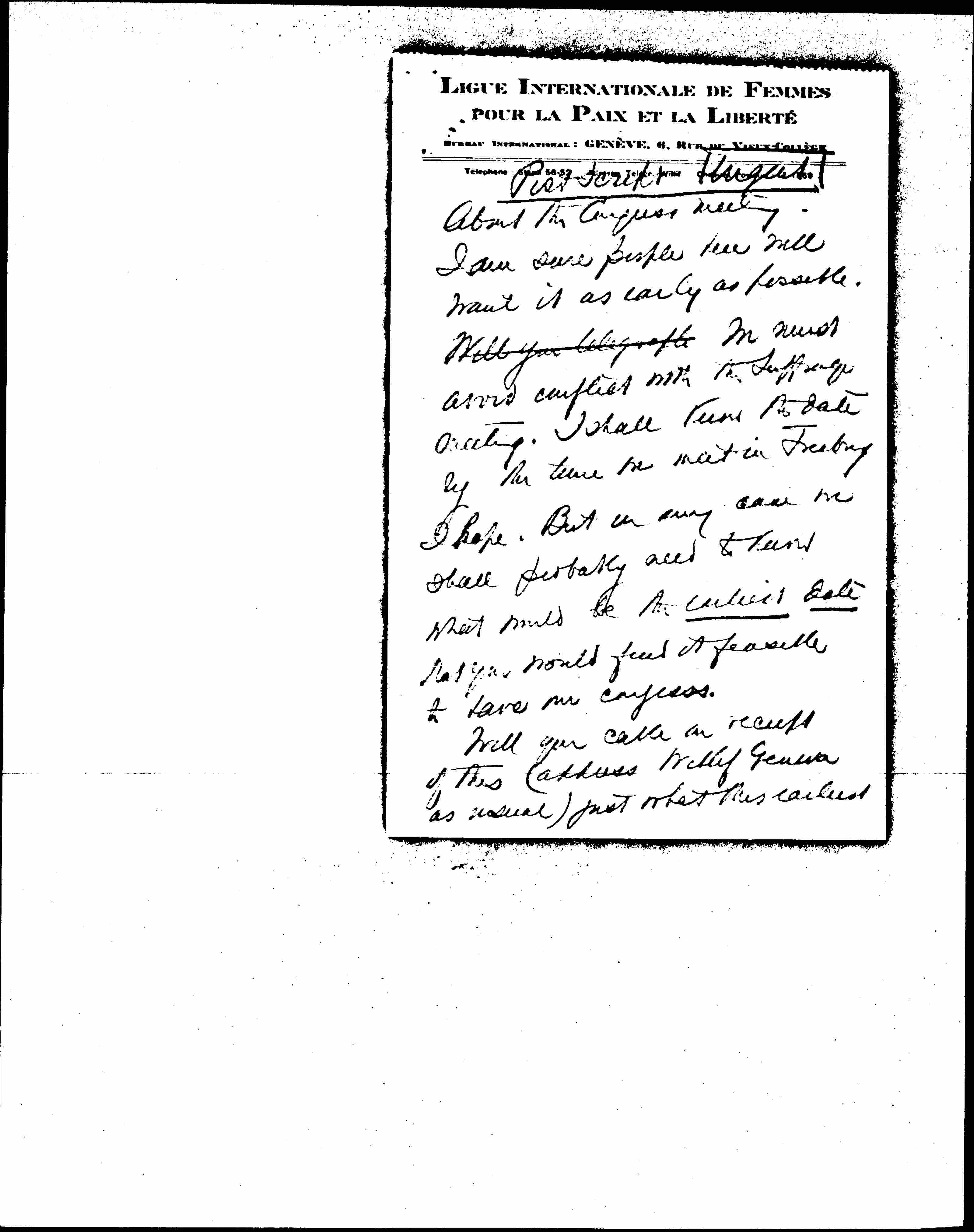 About the Congress meeting. I am sure people here will want it as early as possible. Will you telegraph We must avoid conflict with the Suffrage meeting. I shall know the date by the time we meet in Freiburg I hope. But in any case we shall probably need to know what would be the earliest date that you would find it feasible to have our congress.