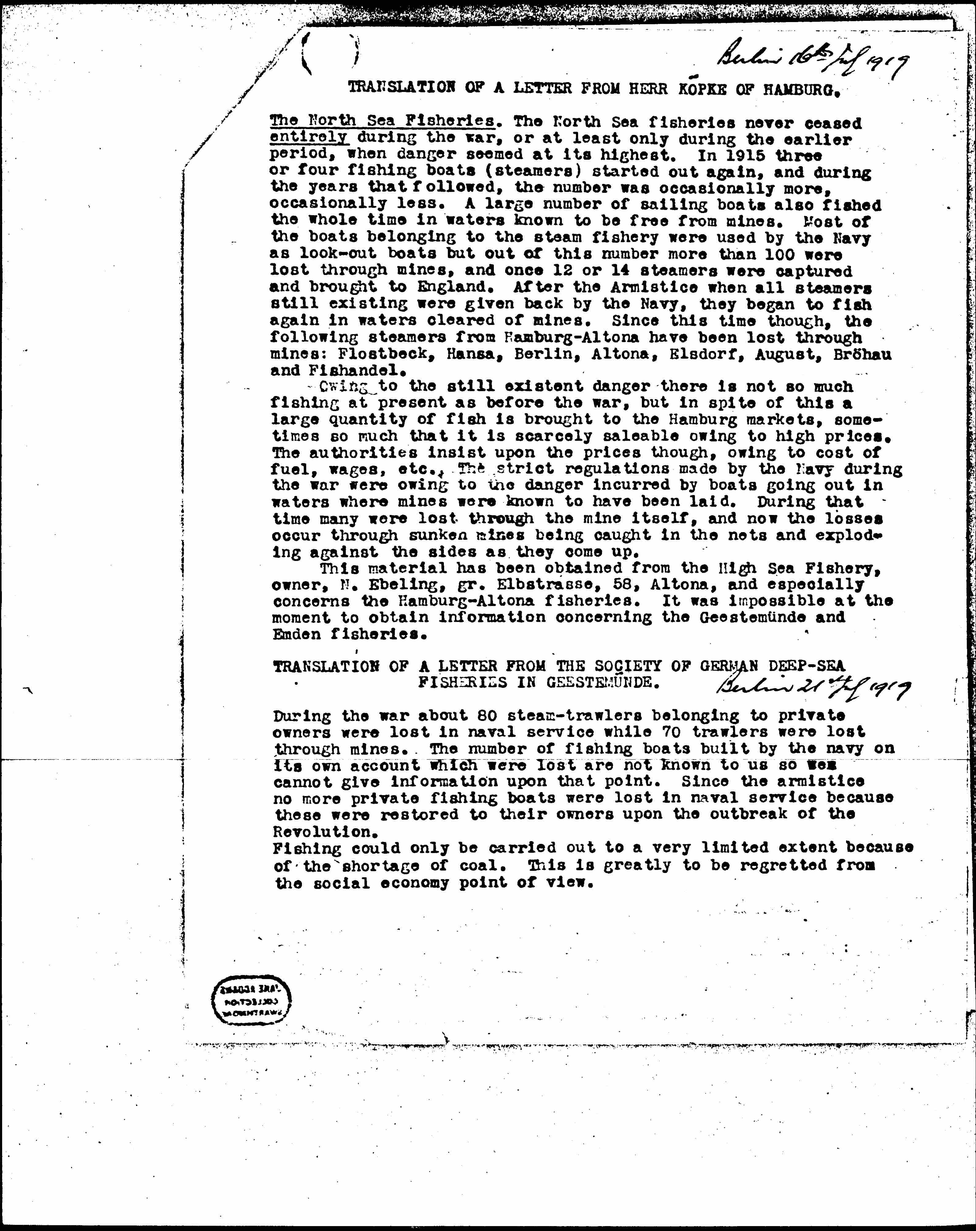 TRANSLATION OF A LETTER FROM THE SOCIETY OF GERMAN DEEP-SEA FISHERIES IN GEESTEMÜNDE