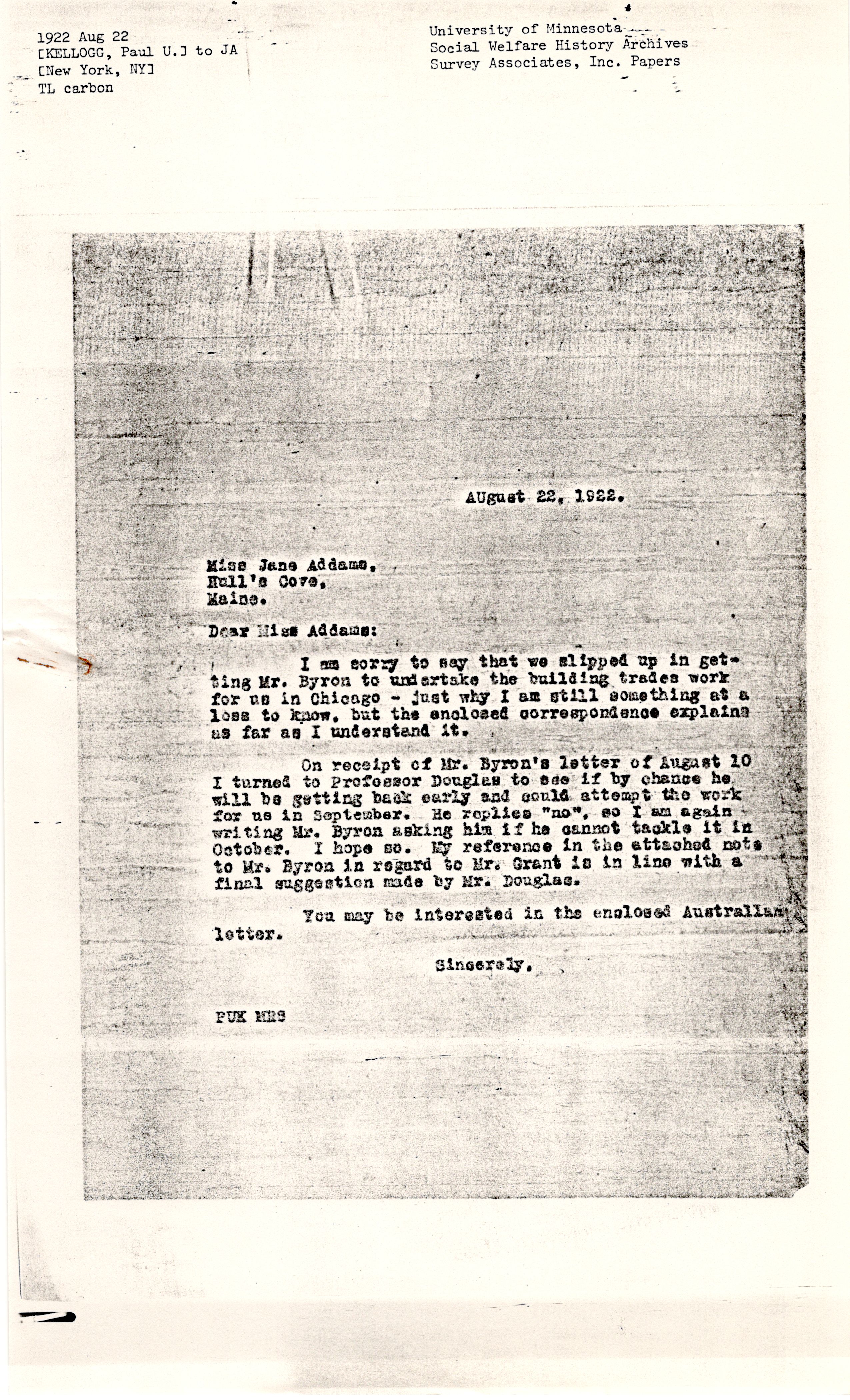 On receipt of Mr. Byron's letter of August 10 I turned to Professor Douglas to see if by chance he will be getting back early and could attempt the work for us in September. He replies "no," so I am again writing Mr. Byron asking him if he cannot tackle it in October. I hope so. My reference in the attached note to Mr. Byron in regard to Mr. Grant is in line with a final suggestion made by Mr. Douglas.