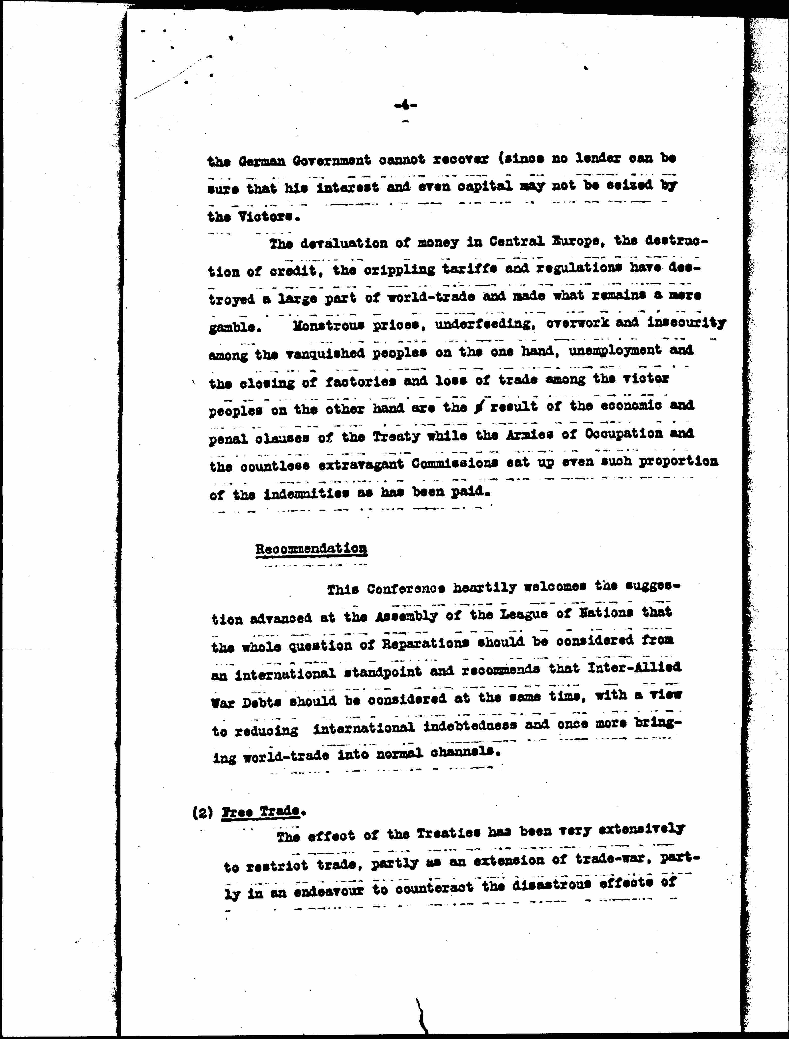This Conference heartily welcomes the suggestion advanced at the Assembly of the League of Nations that the whole question of the Reparations should be considered from an international standpoint and recommends that Inter-Allied War Debts should be considered at the same time, with a view to reducing international indebtedness and once more bringing world-trade into normal channels.
