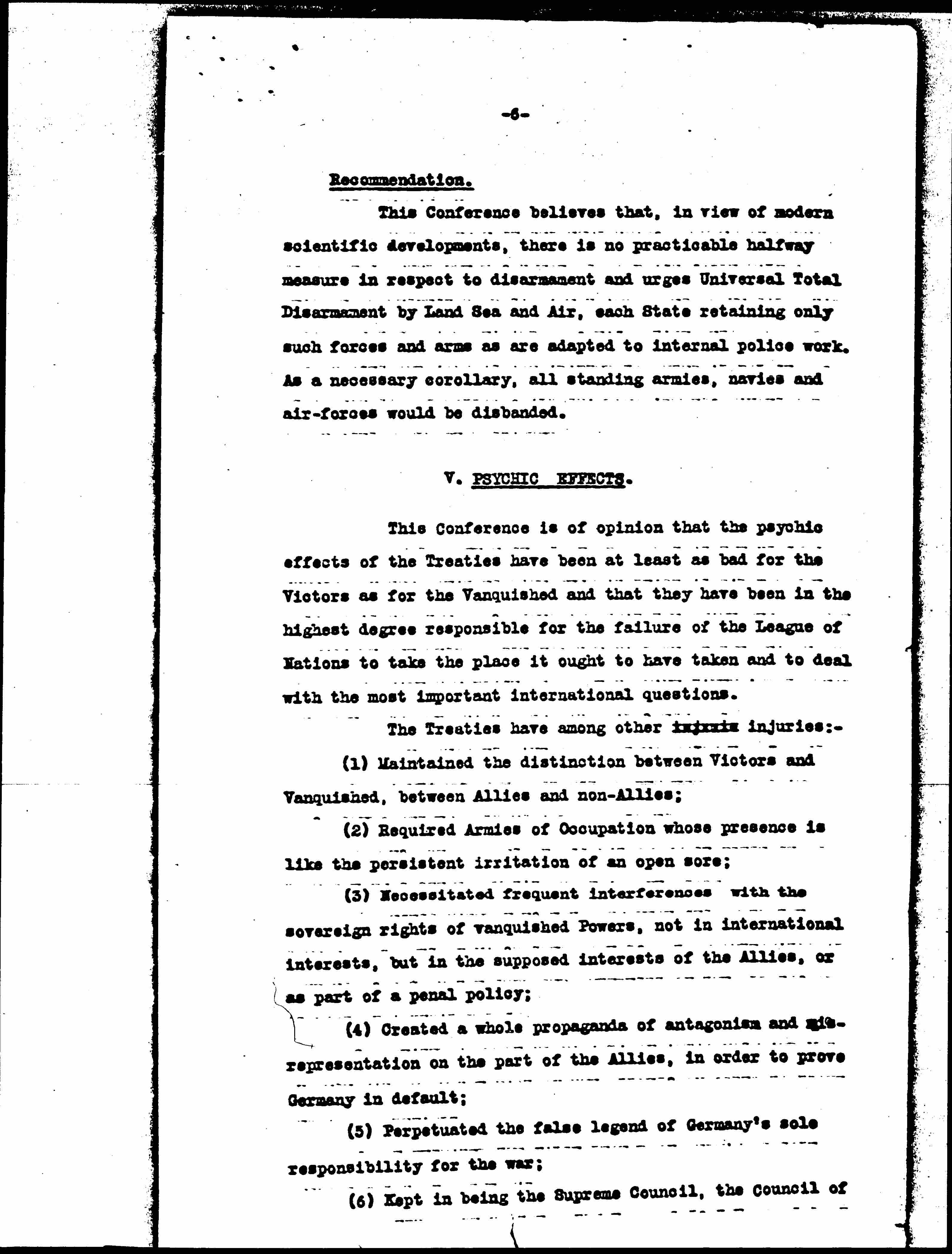 This Conference is of opinion that the psychic effects of the Treaties have been at least as bad for the Victors as for the Vanquished and that they have been in the highest degree responsible for the failure of the League of Nations to take the place it ought to have taken and to deal with the most important international questions.