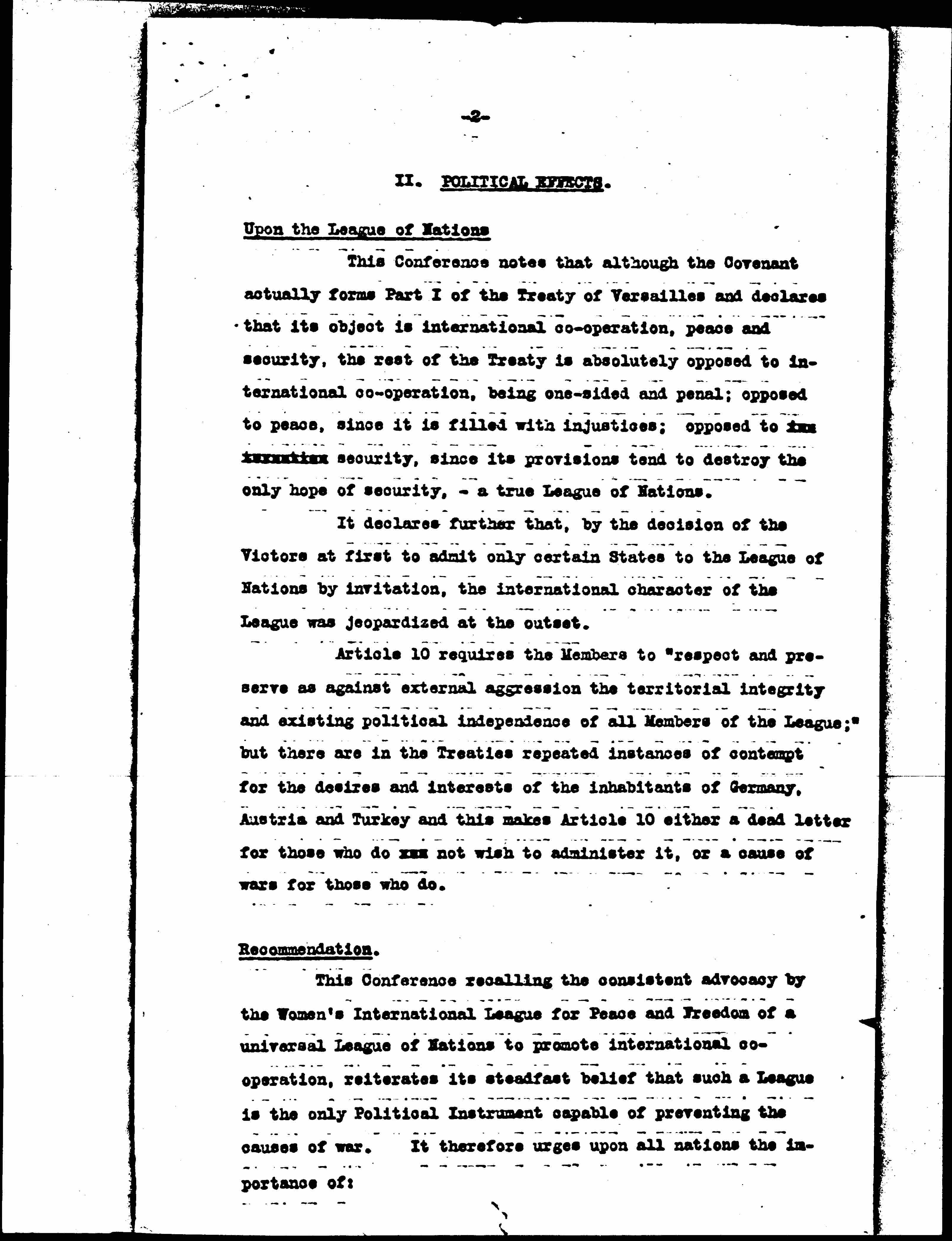 This Conference, organized by the Women’s International League for Peace and Freedom, therefore calls upon the League of Nations to summon a World Congress of all the Powers to discuss A New Peace, whose object shall be to satisfy international interests and to encourage international [cooperation]. [page 2]