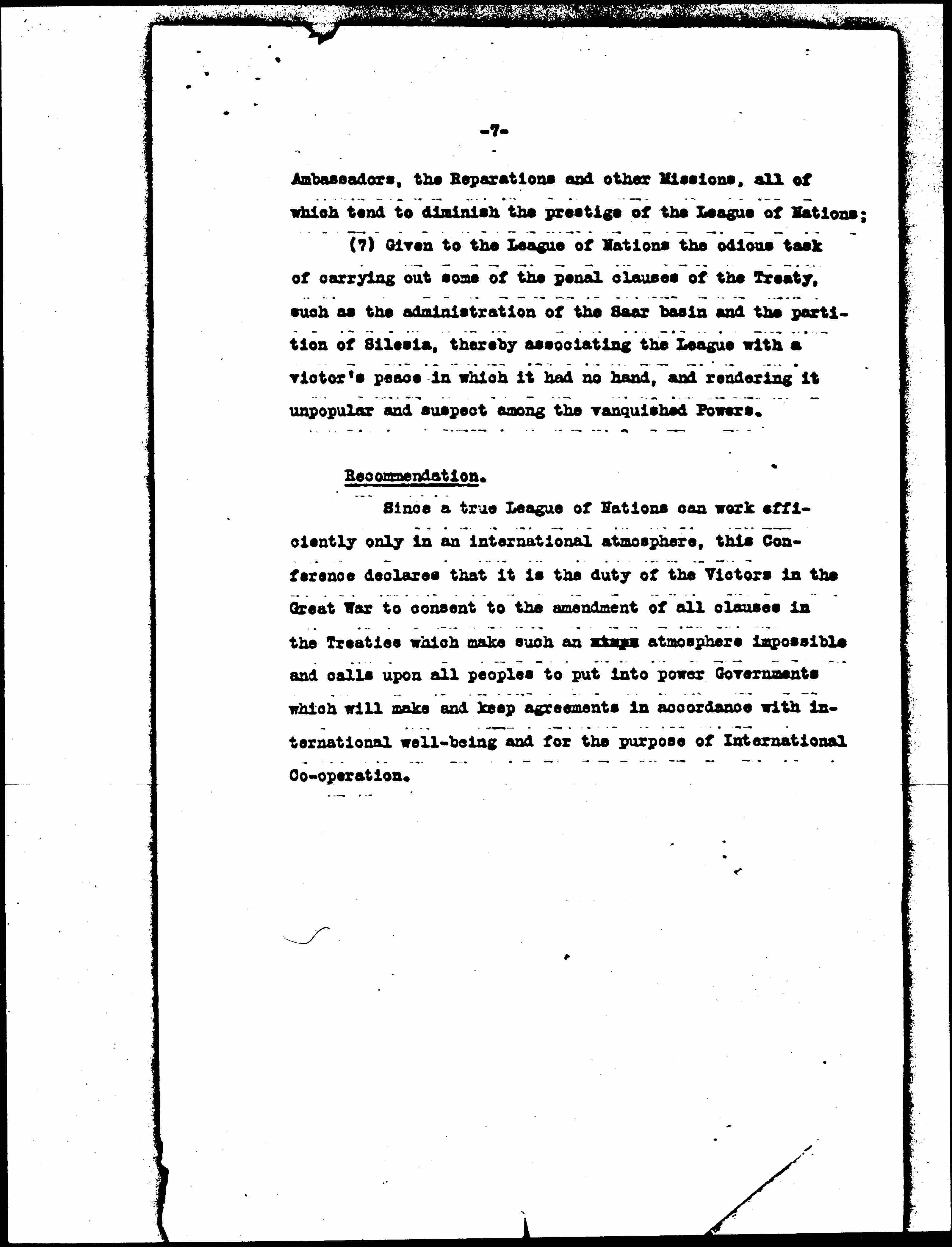 (6) Kept in being the Supreme Council, the council of [page 7] Ambassadors, the Reparations and other Missions, all of which tend to diminish the prestige of the League of Nations;