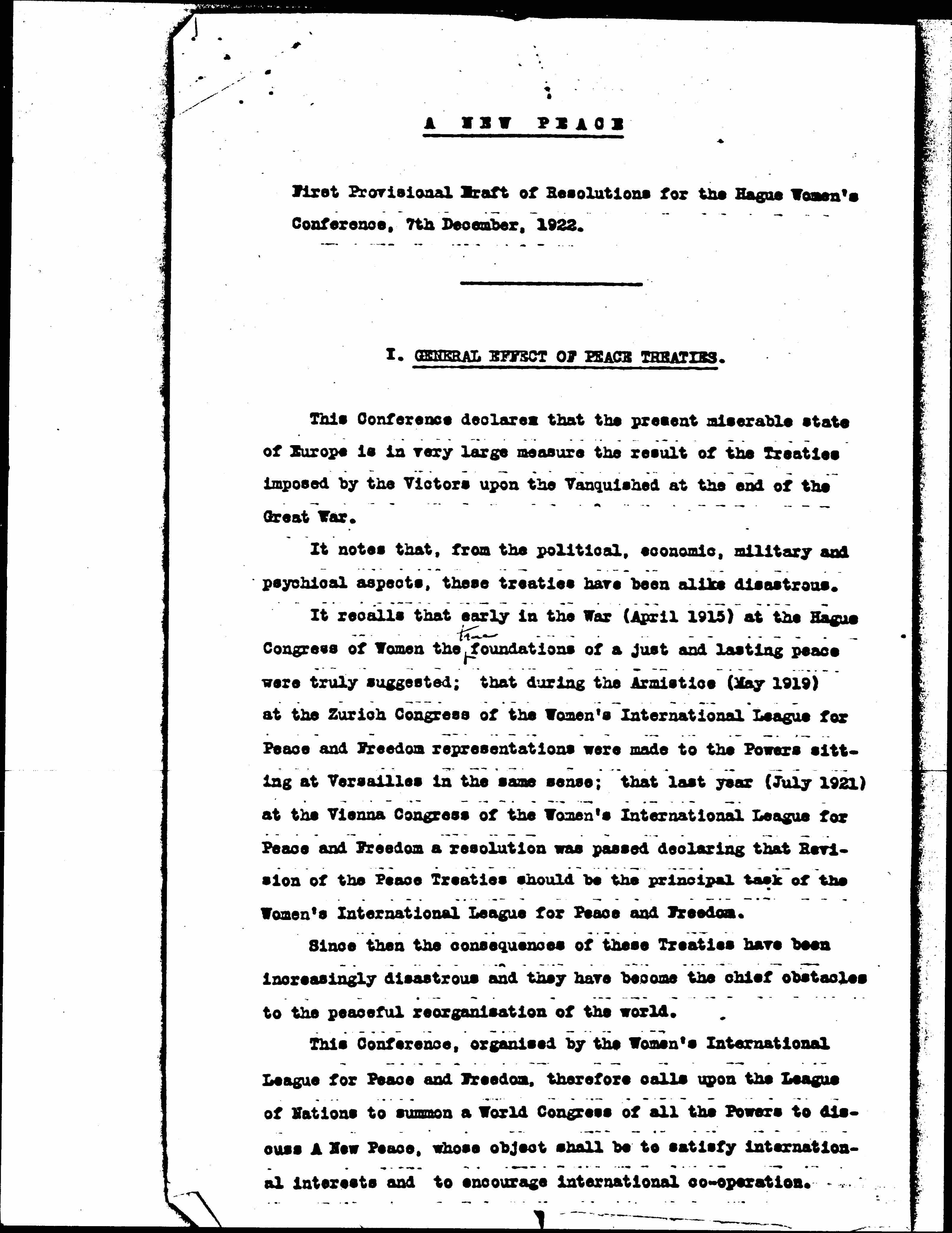 It recalls that early in the War (April 1915) at The Hague Congress of Women the ↑[true]↓ foundations of a just and lasting peace were truly suggested; that during the Armistice (May 1919) at the Zurich Congress of Women’s International League for Peace and Freedom representations were made to the Powers sitting at Versailles in the same sense; that last year (July 1921) at the Vienna Congress of the Women’s International League for Peace and Freedom a resolution was passed declaring that Revisions of the Peace Treaties should be the principal task of the Women’s International League for Peace and Freedom.