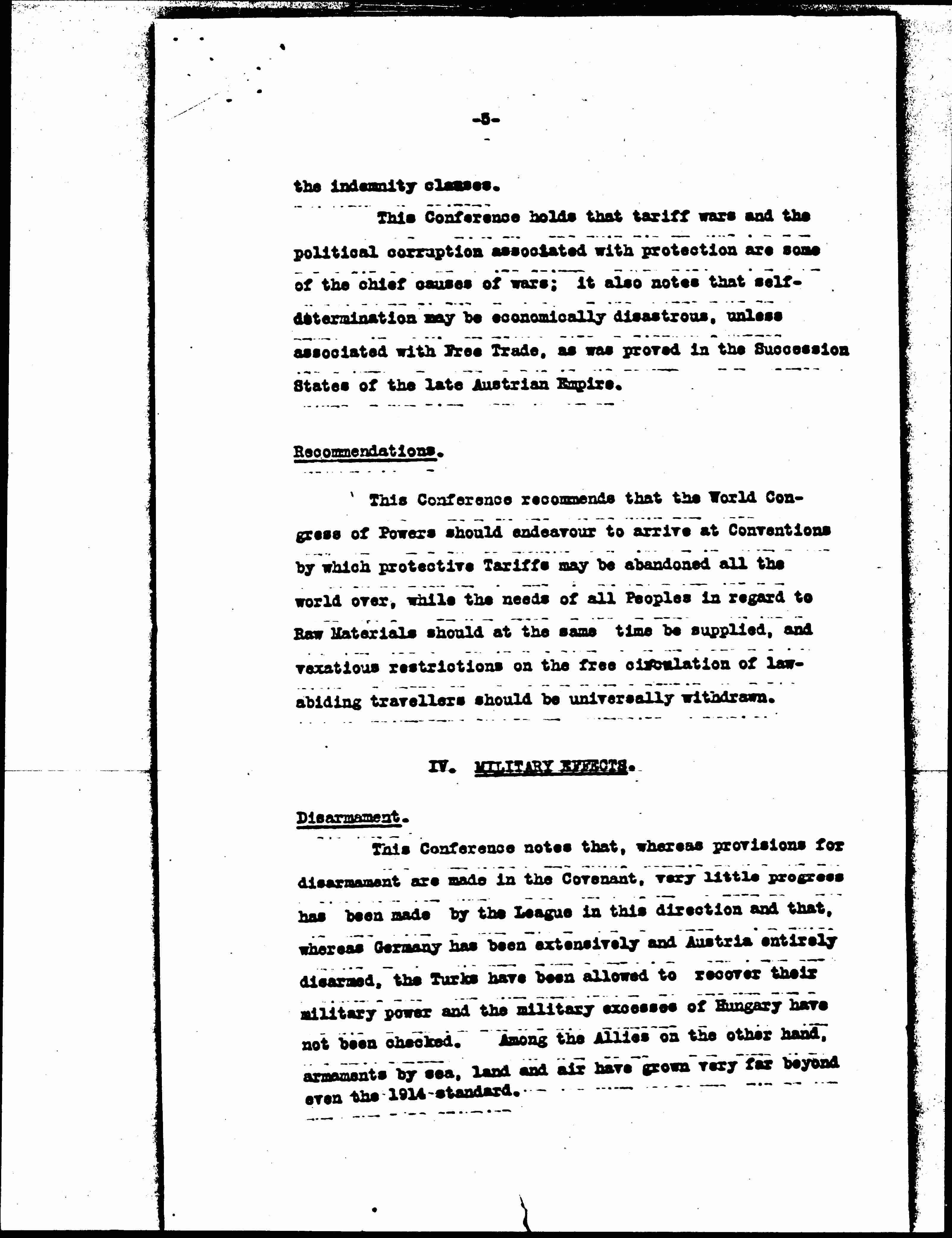 This Conference recommends that the World Congress of Powers should [endeavor] to arrive at Conventions by which protective Tariffs may be abandoned all the world over, while the needs of all Peoples in regard to Raw Materials should at the same time be supplied, and vexatious restrictions on the free circulation of law-abiding [travelers] should be universally withdrawn.