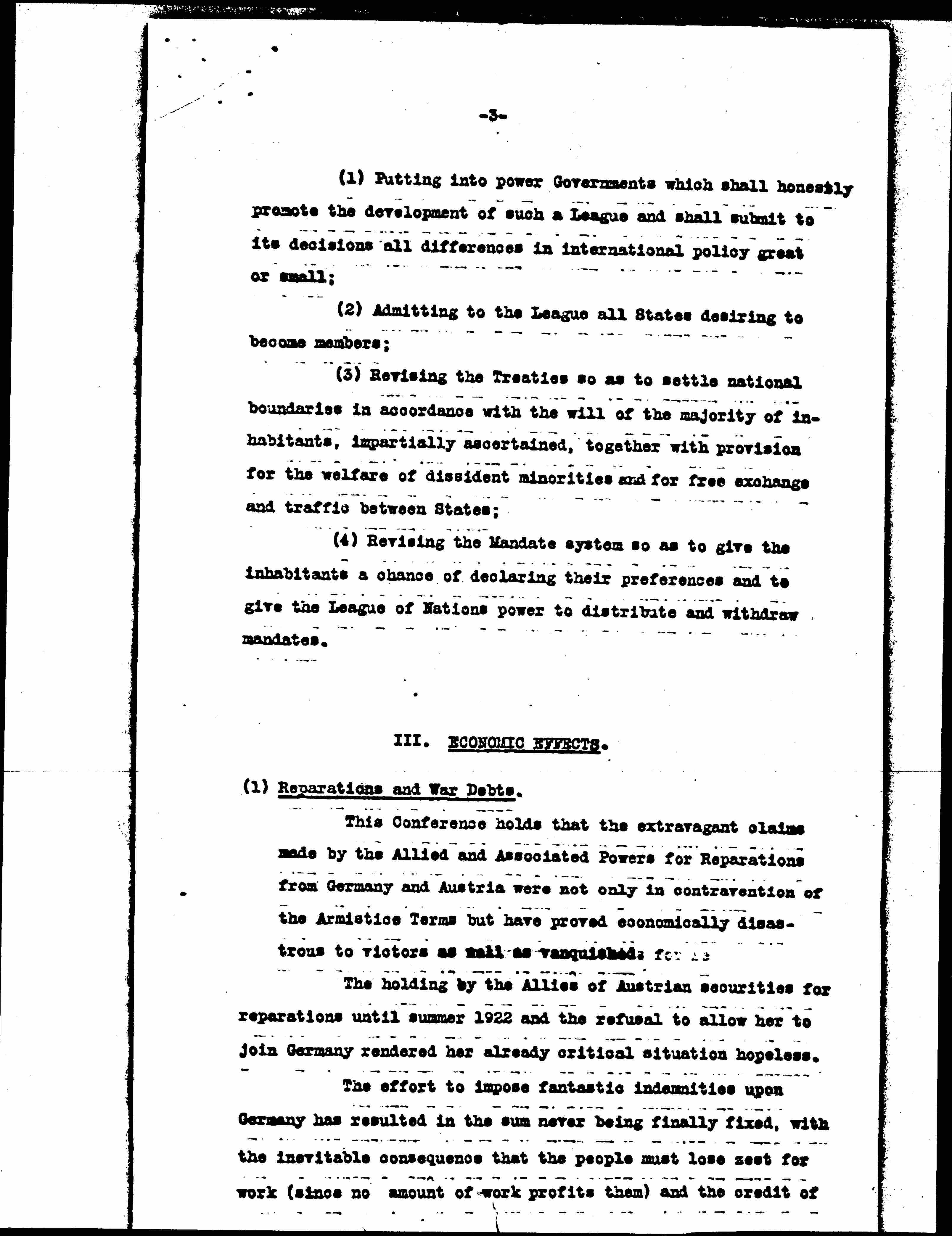 Since a true League of nations can work efficiently only in an international atmosphere, this Conference declares that it is the duty of the Victors in the Great War to consent to the amendment of all clauses in the Treaties which make such an [illegible] atmosphere impossible and calls upon all people to put into power Governments which will make and keep agreements in accordance with international well-being and for the purpose of International [cooperation].