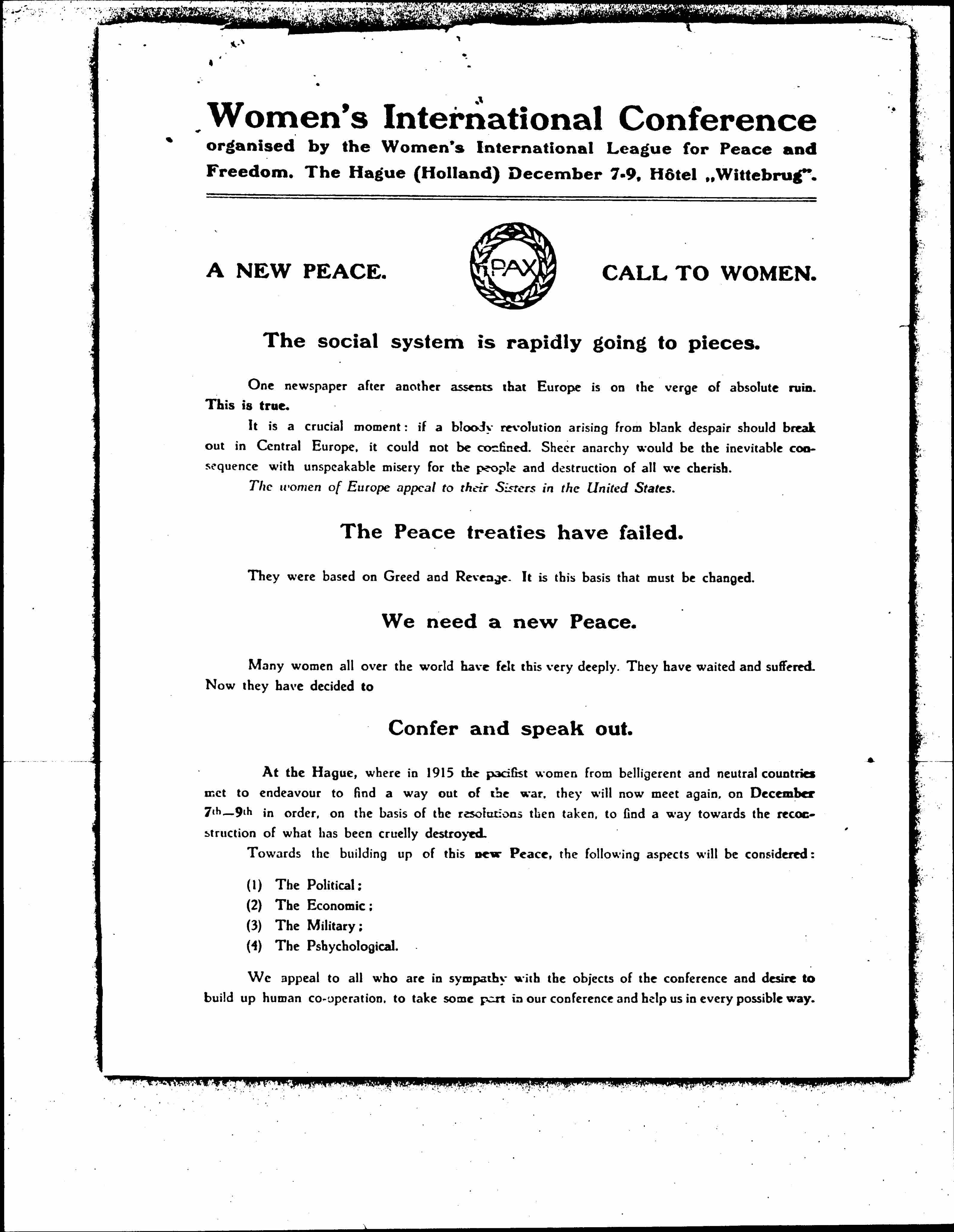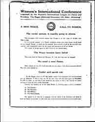 At The Hague, where in 1915 the pacifist women from belligerent and neutral countries met to [endeavor] to find a way out of the war, they will now meet again, on December 7th-9th in order, on the basis of the resolutions then taken, to find a way towards the reconstruction of what has been cruelly destroyed.