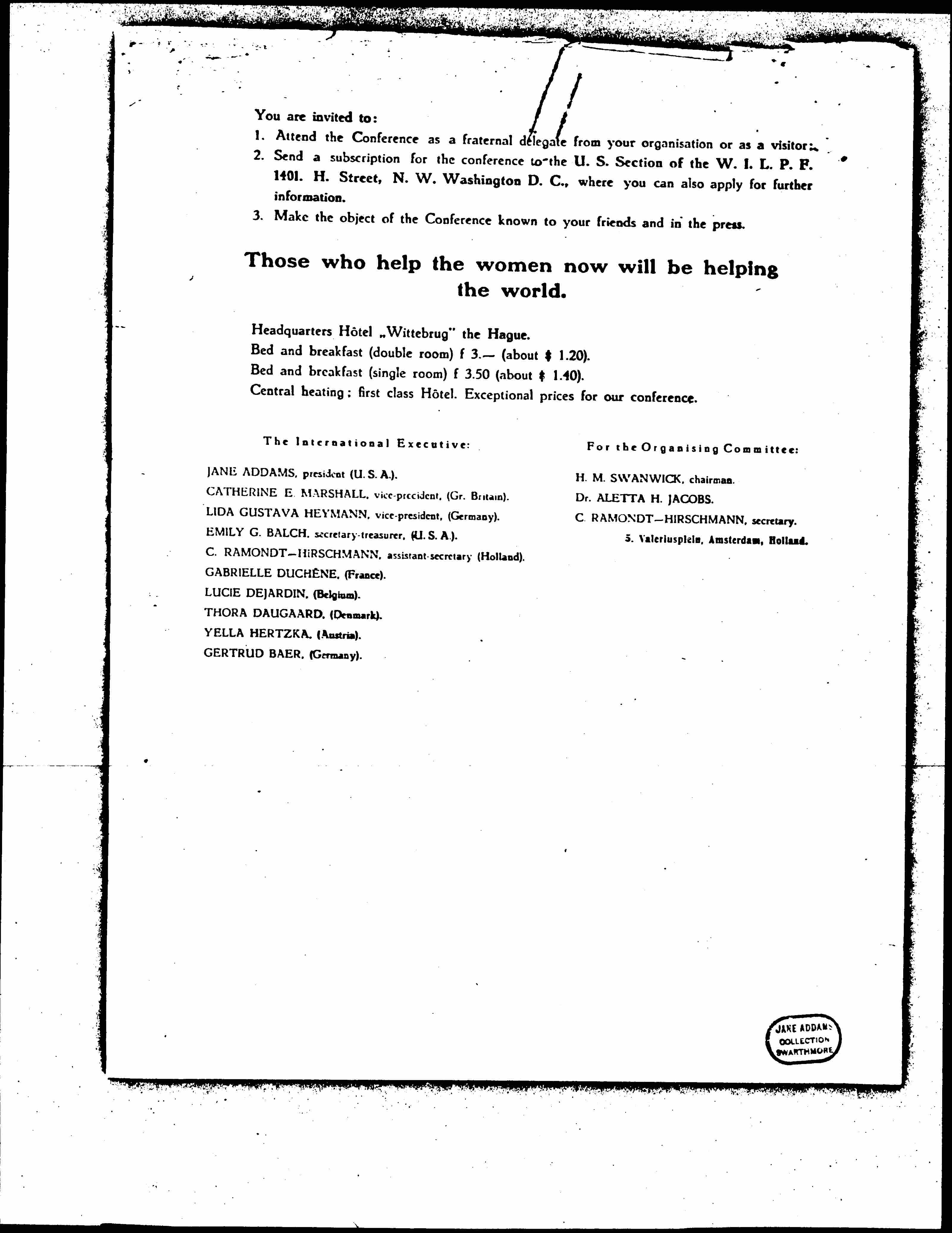 2. Send a subscription for the conference to the U.S. Section of the W.I.L.P.F. 1401. H. Street, N.W. Washington D.C., where you can also apply for further information.
