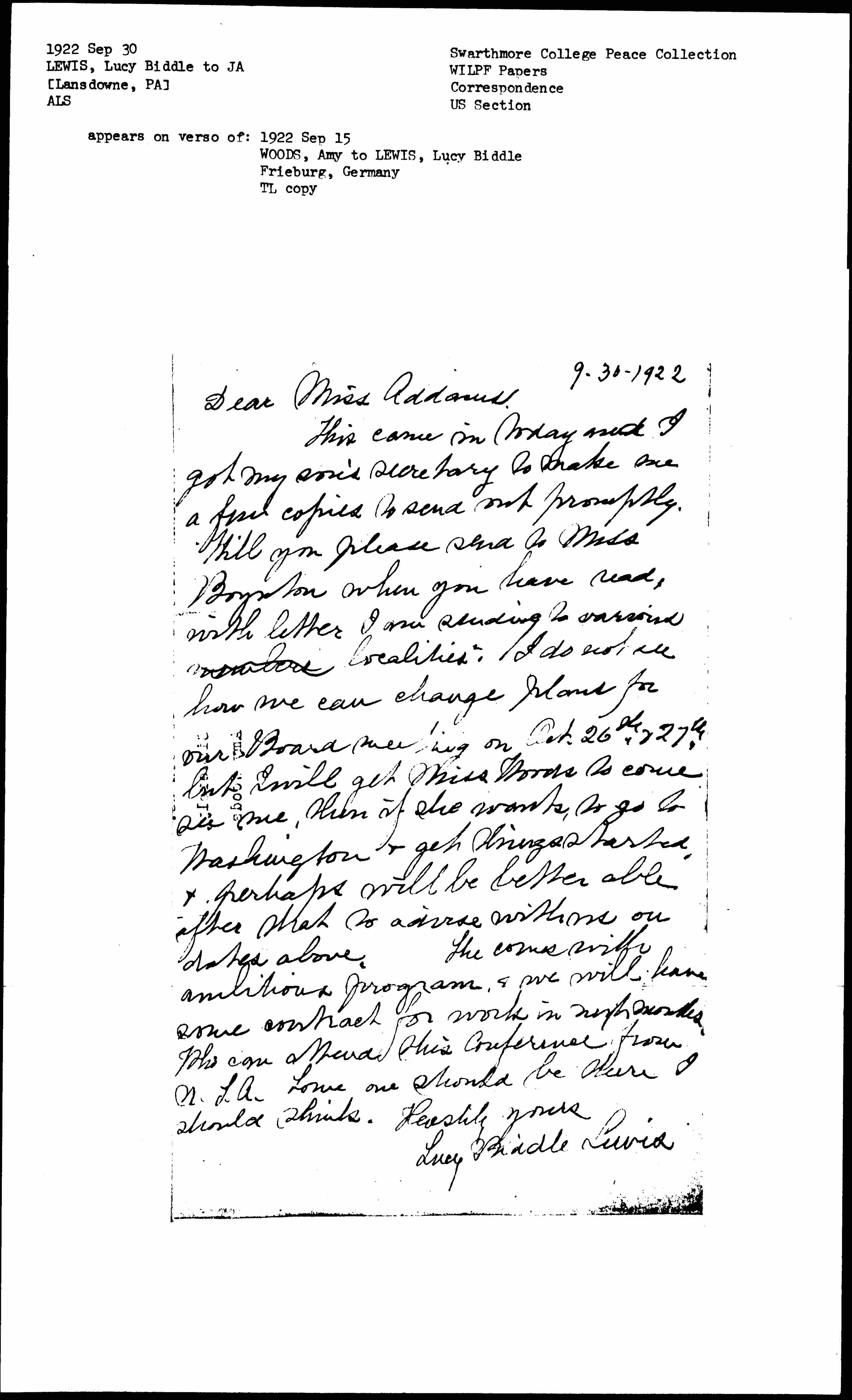 This came in today and I got my son’s secretary to make me a few copies to send out promptly. Will you please send to Miss Boynton when you have read, with letter I am sending to various members localities. I do not see how we can change plans for our Board meeting on Oct. 26th & 27th but I will get Miss Woods to come see me, then if she wants, to go to Washington & get things started & perhaps will be better able after that to advise with me on dates above. This comes with ambitious program, & we will have some contract for work in next months. Who can attend this conference from U.S.A. Some one should be there I should think. Hastily yours