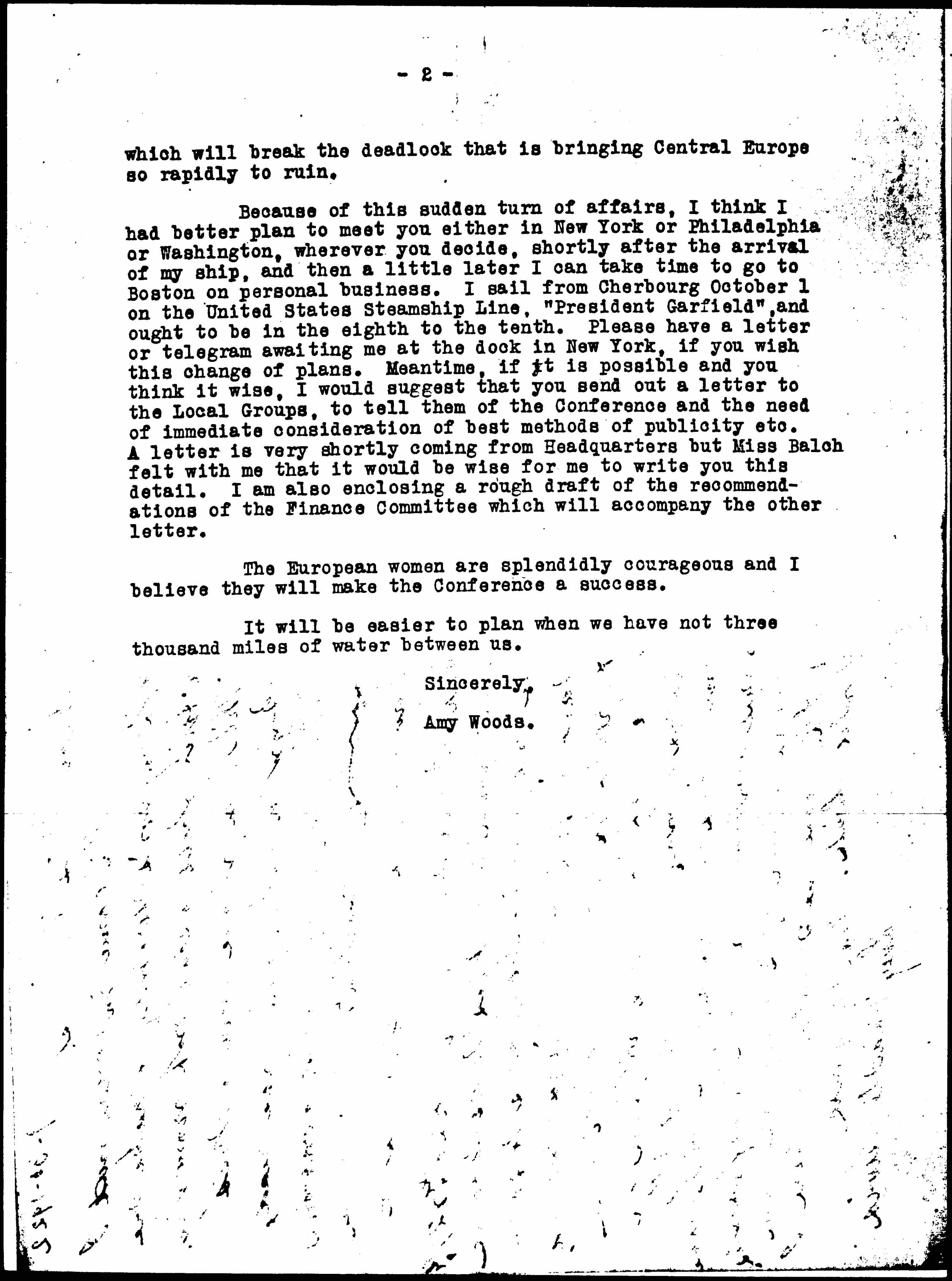 Because of this sudden turn of affairs, I think I had better plan to meet you either in New York or Philadelphia or Washington, wherever you decide, shortly after the arrival of my ship, and then a little later I can take time to go to Boston on personal business. I sail from Cherbourg October 1 on the United States Steamship Line, “President Garfield”, and ought to be in the eighth to the tenth. Please have a letter or telegram awaiting me at the dock in New York, if you wish this change of plans. Meantime, if it is possible and you think it wise, I would suggest that you send out a letter to the Local Groups, to tell them of the Conference and the need of immediate consideration of best methods of publicity etc. A letter is very shortly coming from Headquarters but Miss Balch felt with me that it would be wise for me to write you this detail. I am also enclosing a rough draft of the recommendations of the Finance Committee which will accompany the other letter.