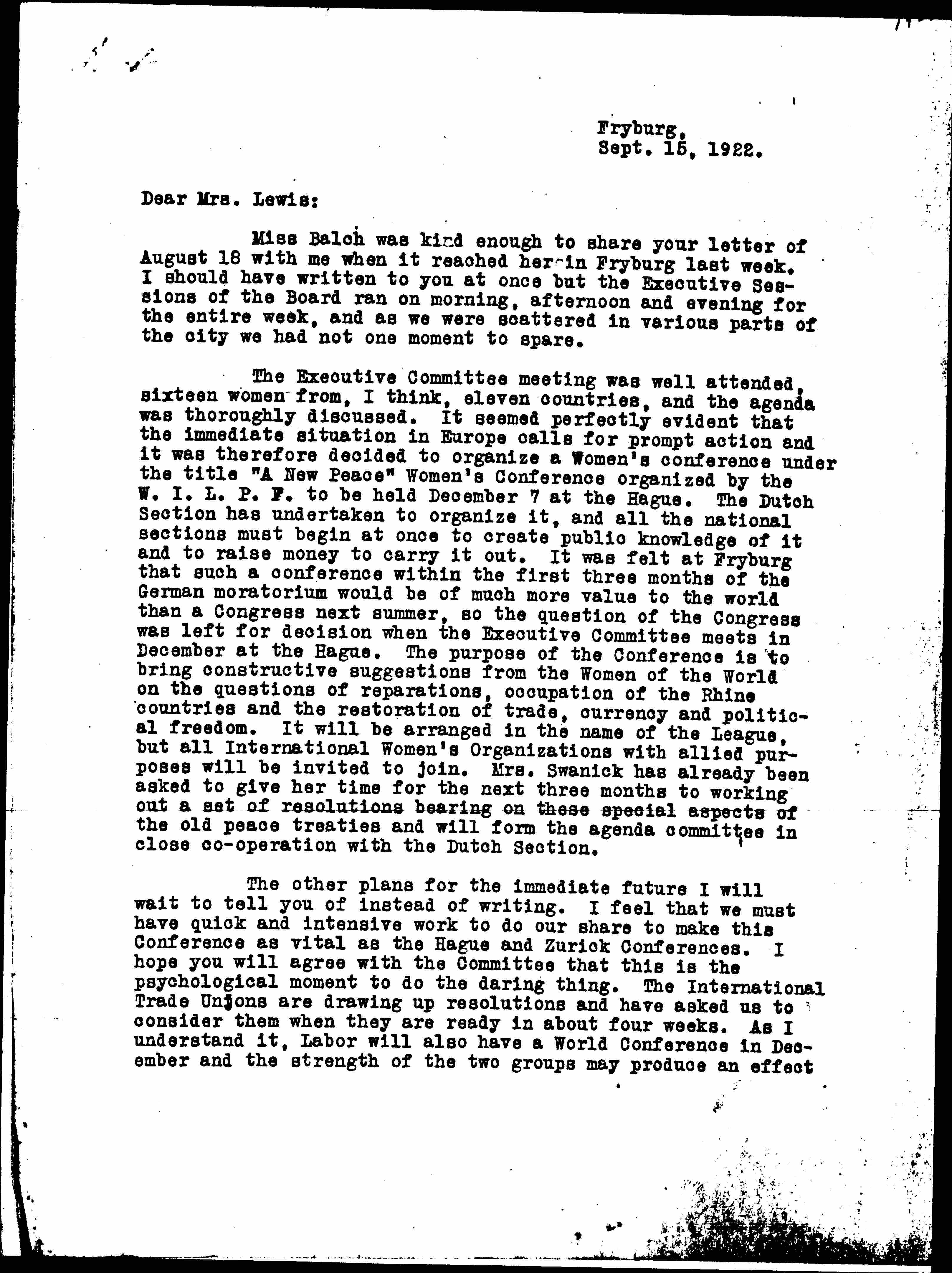 The other plans for the immediate future I will wait to tell you instead of writing. I feel that we must have quick and intensive work to do our share to make this Conference as vital as The Hague and [Zurich] Conferences. I hope you will agree with the Committee that this is the psychological moment to do the daring thing. The International Trade Unions are drawing up resolutions and have asked us to consider them when they are ready in about four weeks. As I understand it, Labor will also have a World Conference in December and the strength of the two groups may produce an effect [page 2] which will break the deadlock that is bringing Central Europe so rapidly to ruin.