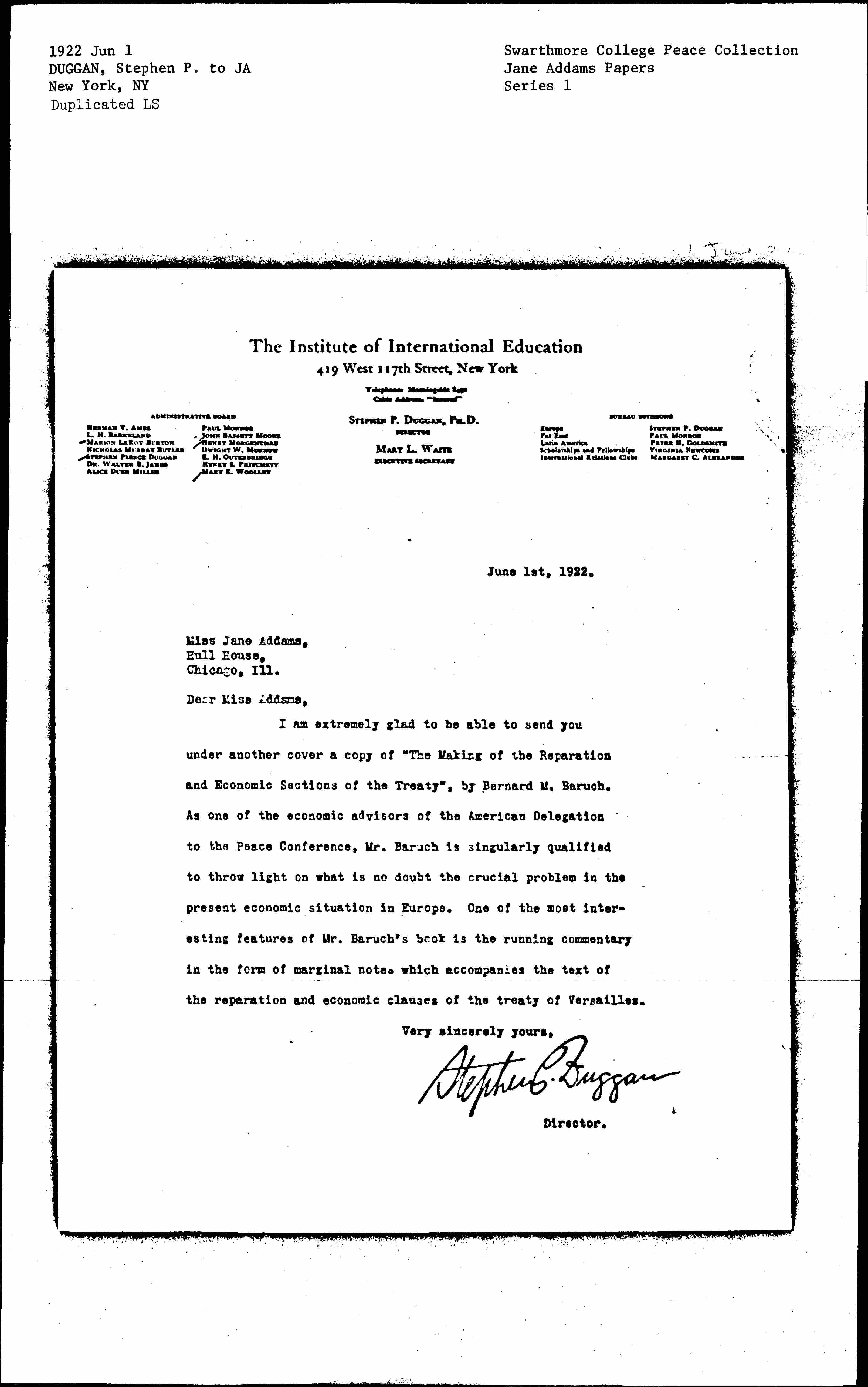 I am extremely glad to be able to send you under another cover a copy of “The Making of the Reparation and Economic Sections of the Treaty”, by Bernard M. Baruch. As one of the economic advisors of the American Delegation to the Peace Conference, Mr. Baruch is singularly qualified to throw light on what is no doubt the crucial problem in the present economic situation in Europe. One of the most interesting features of Mr. Baruch’s book is the running commentary in the form of marginal notes which accompanies the text of the reparation and economic clauses of the treaty of Versailles.