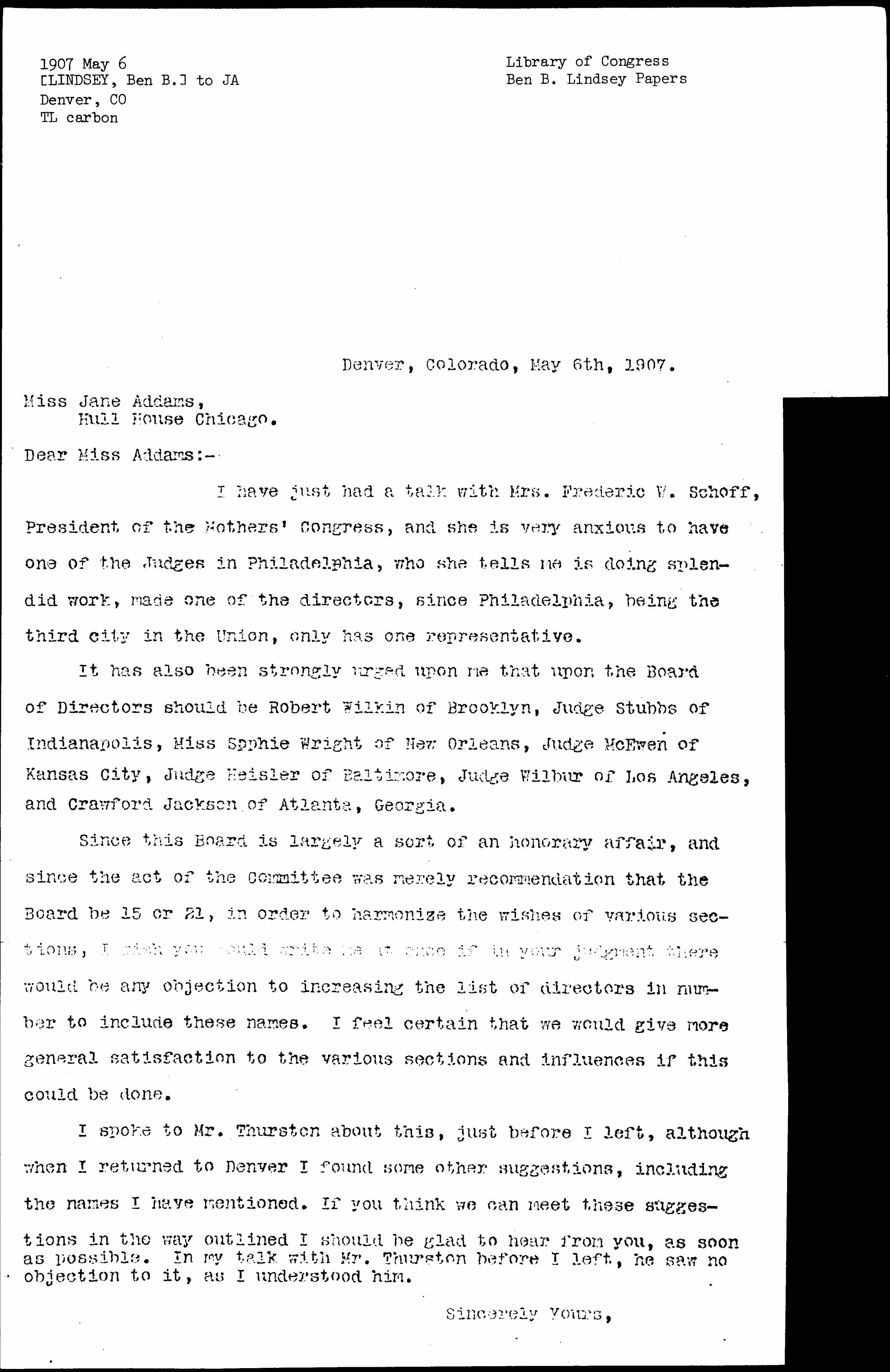 I have just had a talk with Mrs. Frederic W. Schoff, President of the Mothers' Congress, and she is very anxious to have one of the Judges in Philadelphia, who she tells me is doing splendid work, made one of the directors, since Philadelphia, being the third city in the Union, only has one representative.