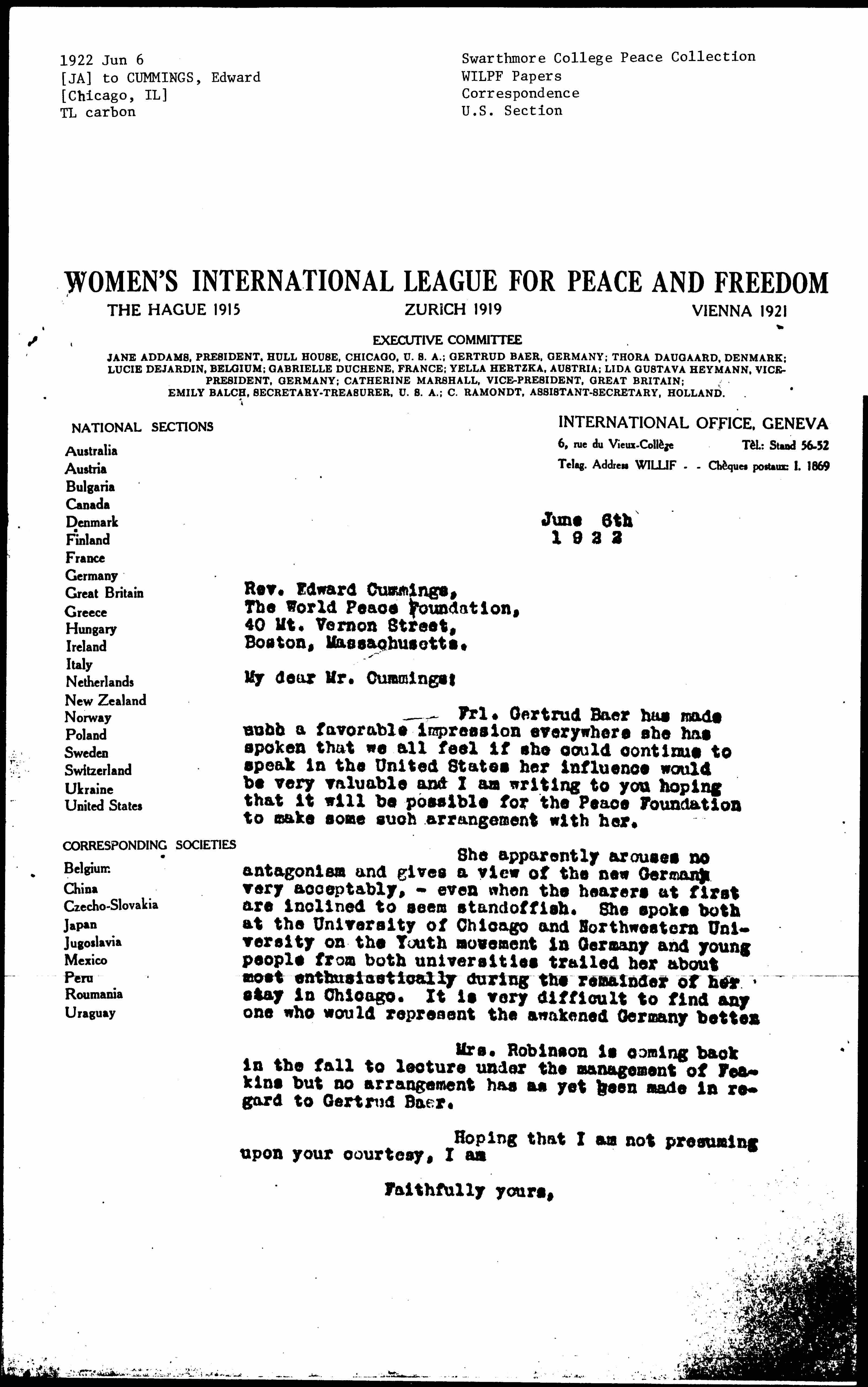 Frl. Gertrud Baer has made such a favorable impression everywhere she has spoken that we all feel if she could continue to speak in the United States her influence would be very valuable and I am writing to you hoping that it will be possible for the Peace Foundation to make some such arrangement with her.