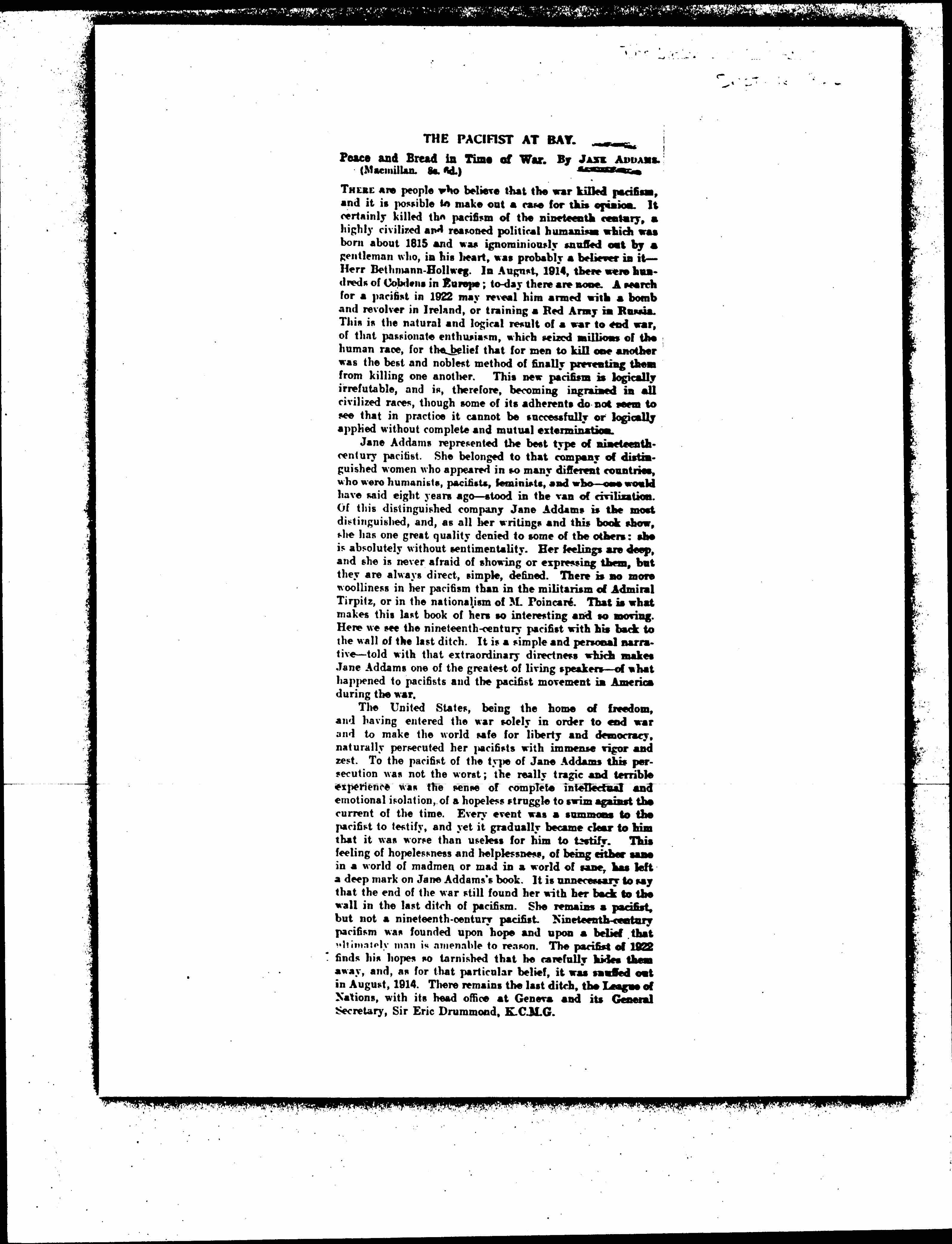 Jane Addams represented the best type of nineteenth-century pacifist. She belonged to that company of distinguished women who appeared in so many different countries, who were humanists, pacifists, feminists, and who -- one would have said eight years ago -- stood in the van of civilization. Of this distinguished company Jane Addams is the most distinguished, and, as all her writings and this book show, she has one great quality denied to some of the others: she is absolutely without sentimentality. Her feelings are deep, and she is never afraid of showing or expressing them, but they are always direct, simple, defined. There is no more woolliness in her pacifism than in the militarism of Admiral Tirpitz, or in the nationalism of M. Poincaré. That is what makes this last book of hers so interesting and so moving. Here we see the nineteenth-century pacifist with his back to the wall of the last ditch. It is a simple and personal narrative -- told with that extraordinary directness which makes Jane Addams one of the greatest of living speakers -- of what happened to pacifists and the pacifist movement in America during the war.