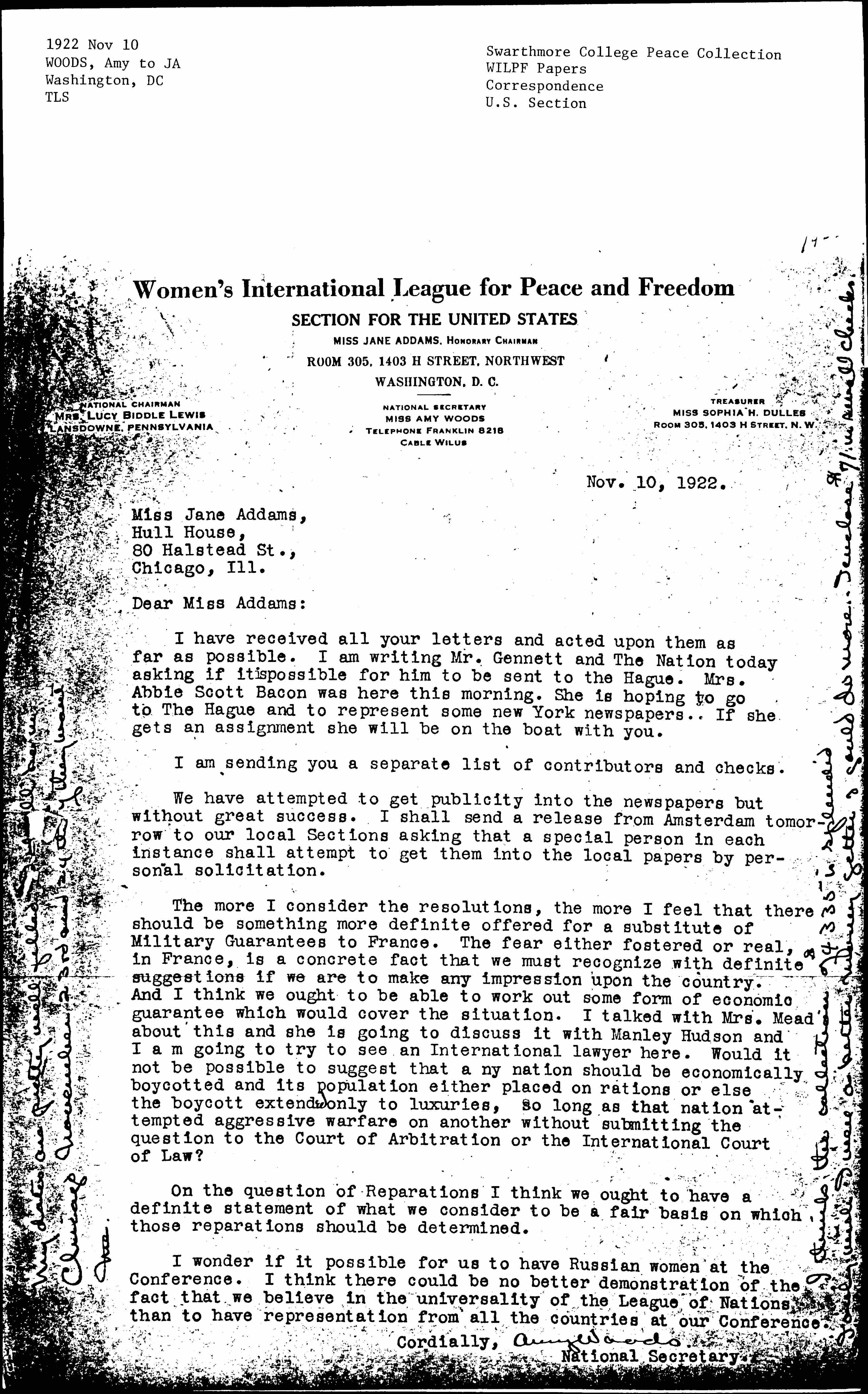 I have received all your letters and acted upon them as far as possible. I am writing for Mr. [Gannett] and The Nation today asking if it is possible for him to be sent to The Hague. Mrs. Abbie Scott [Baker] was here this morning. She is hoping to go to The Hague and to represent some New York newspapers. If she gets an assignment she will be on the boat with you.