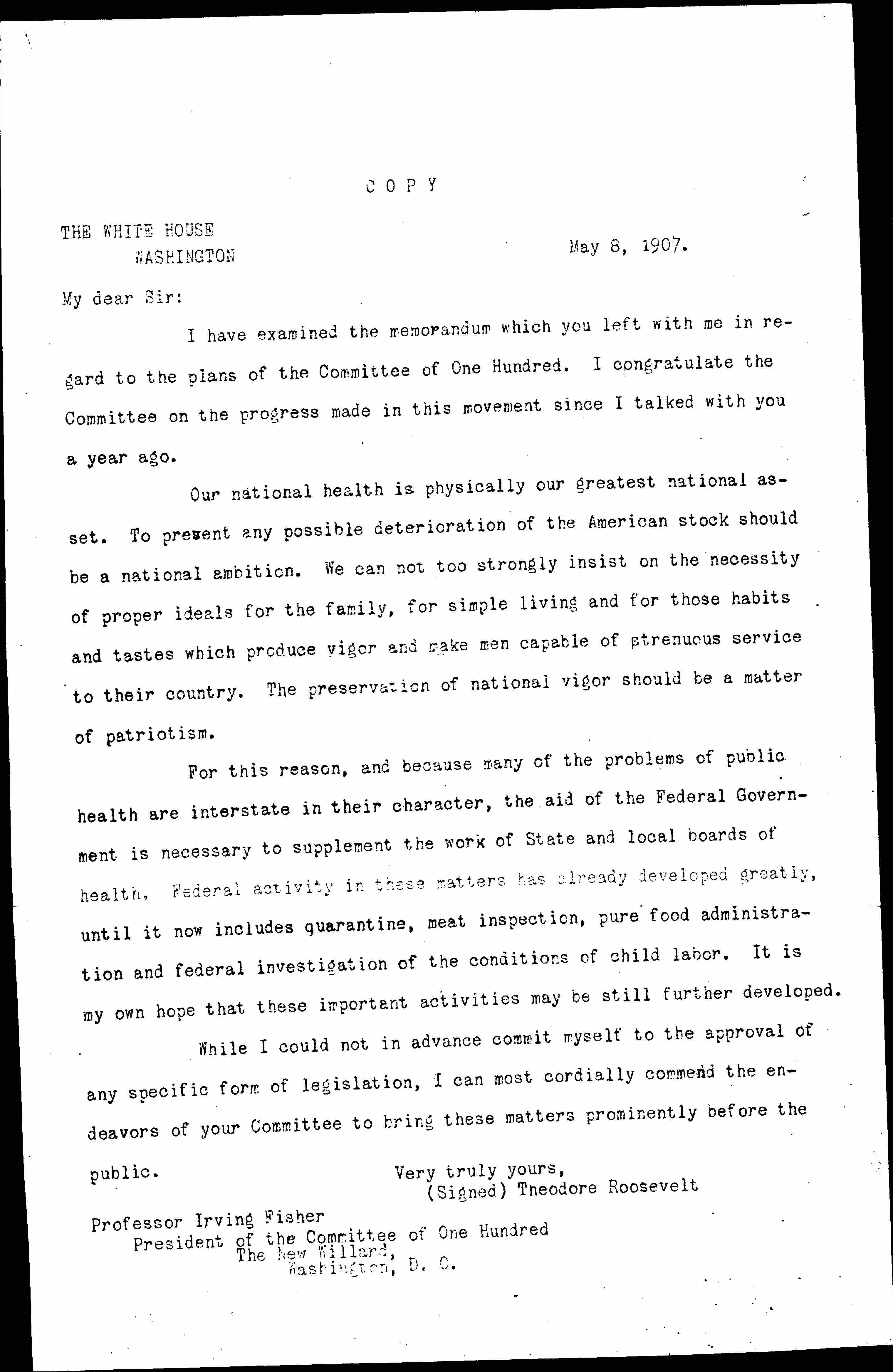 I have examined the memorandum which you left with me in regard to the plan of the Committee of One Hundred. I congratulate the Committee on the progress made in this movement since I talked with you a year ago.