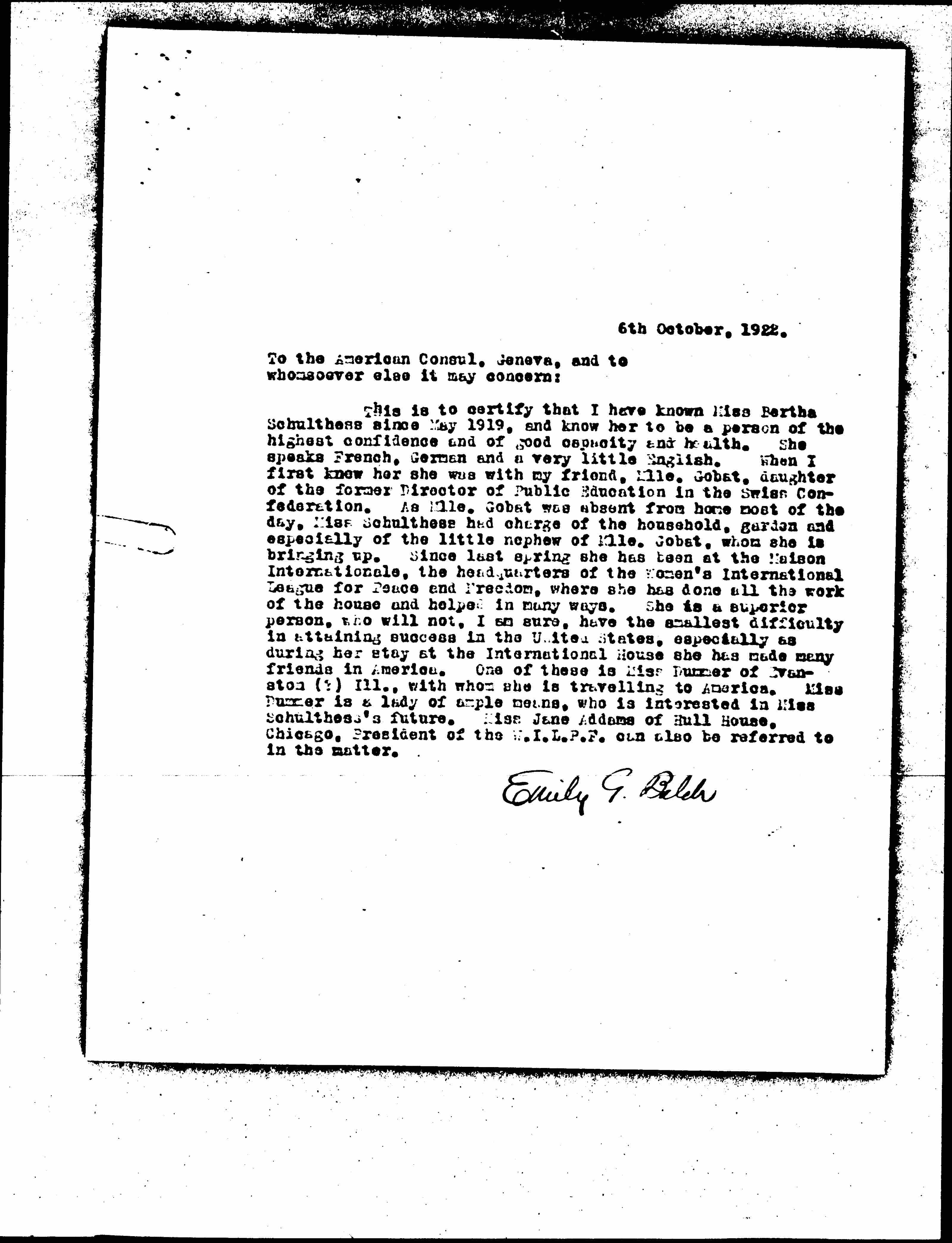 This is to certify that I have known Miss Bertha Schulthess since May 1919, and know her to be a person of the highest confidence and of good capacity and health. She speaks French, German and a very little English. When I first knew her she was with my friend, Mlle. Gobat, daughter of the former Director of Public Education in the Swiss Confederation. As Mlle. Gobat was absent from home most of the day, Miss Schulthess had charge of the household, garden and especially of the little nephew of Mlle. Gobat, whom she is bringing up. Since last spring she has been at the Maison Internationale, the headquarters of the Women’s International League for Peace and Freedom, where she has done all the work of the house and helped in many ways. She is a superior person, who will not, I am sure, have the smallest difficulty in attaining success in the United States, especially as during her stay at the International House she has made many friends in America. One of these is Miss Dummer of Evanston (?) Ill., with whom she is [traveling] to America. Miss Dummer is a lady of ample means, who is interested in Miss Schulthess’s future. Miss Jane Addams of Hull-House, Chicago, President of the W.I.L.P.F. can also be referred to in the matter.