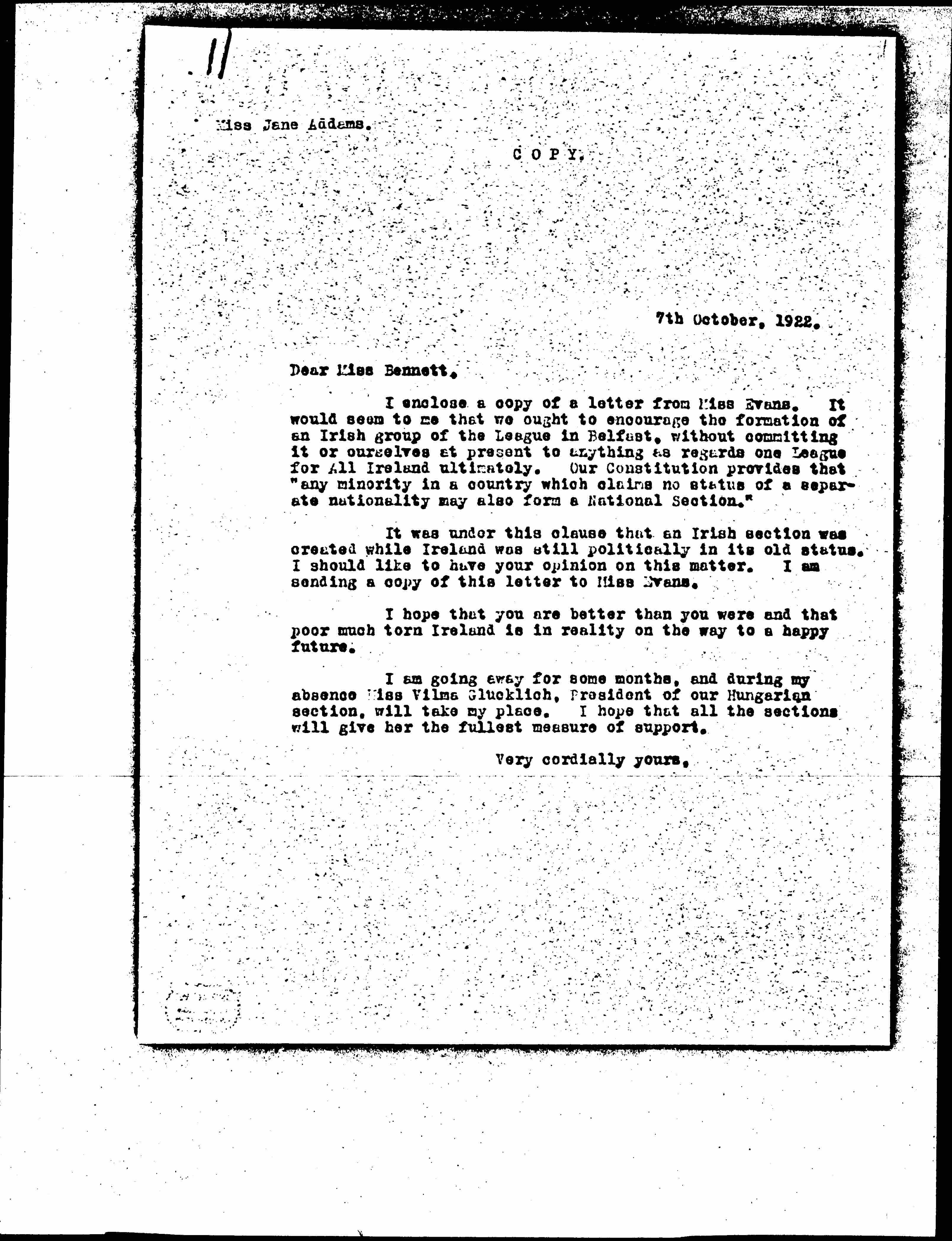 I enclose a copy of a letter from Miss Evans. It would seem to me that we ought to encourage the formation of an Irish group of the League in Belfast, without committing it or ourselves at present to anything as regards one League for All Ireland ultimately. Our Constitution provides that “any minority in a country which claims no status of a separate nationality may also form a National Section.”