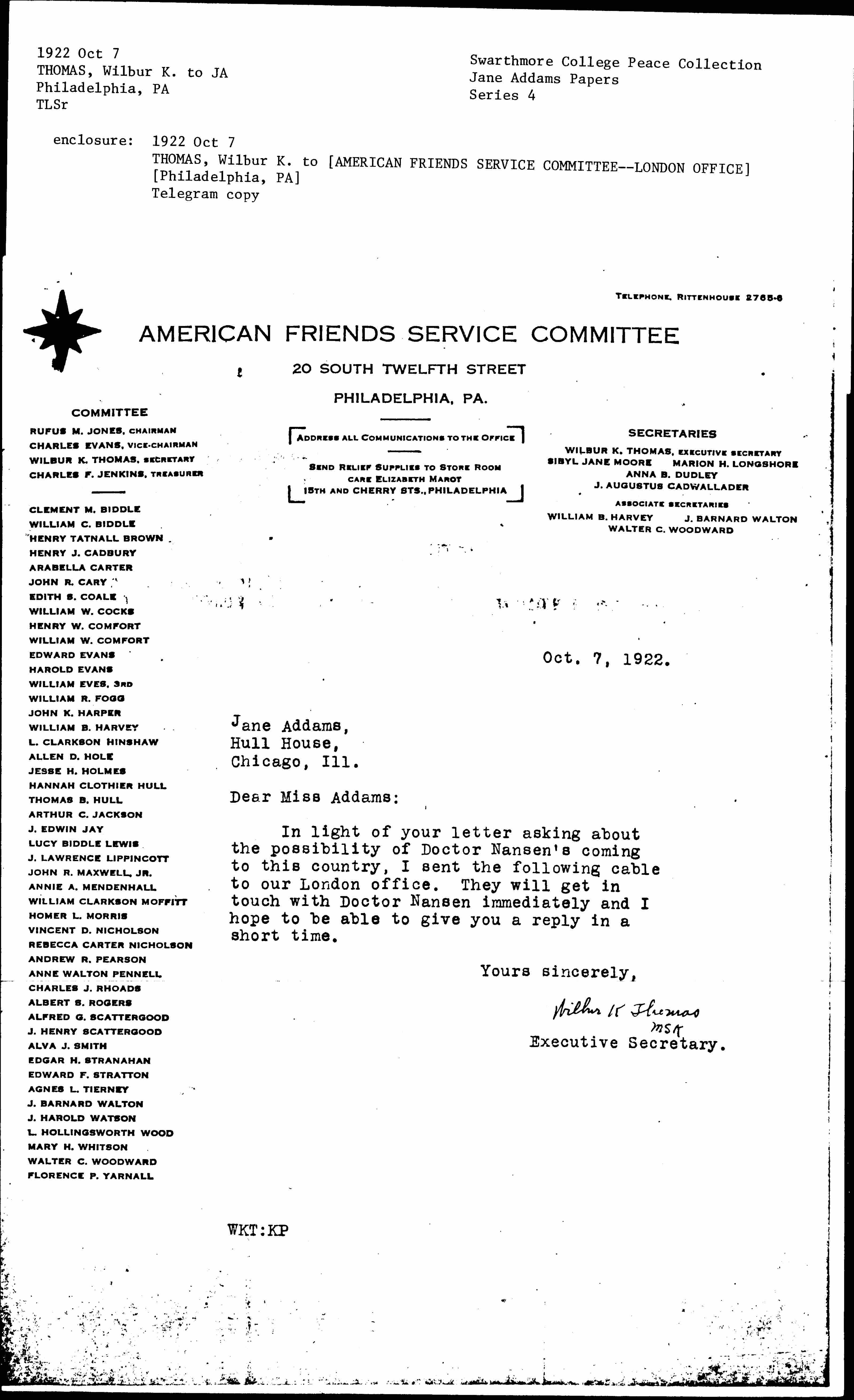 In light of your letter asking about the possibility of Doctor Nansen’s coming to this country, I sent the following cable to our London office. They will get in touch with Doctor Nansen immediately and I hope to be able to give you a reply in a short time.