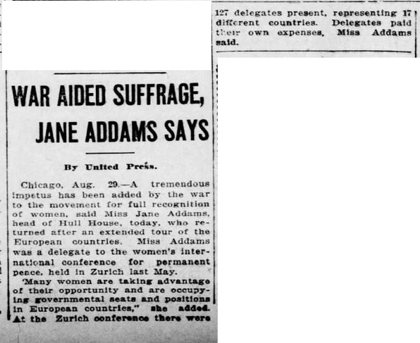 "Many women are taking advantage of their opportunity and are occupying governmental seats and positions in European countries," she added. At the Zurich conference there were 127 delegates present, representing 17 different countries. Delegates paid their own expenses, Miss Addams said.