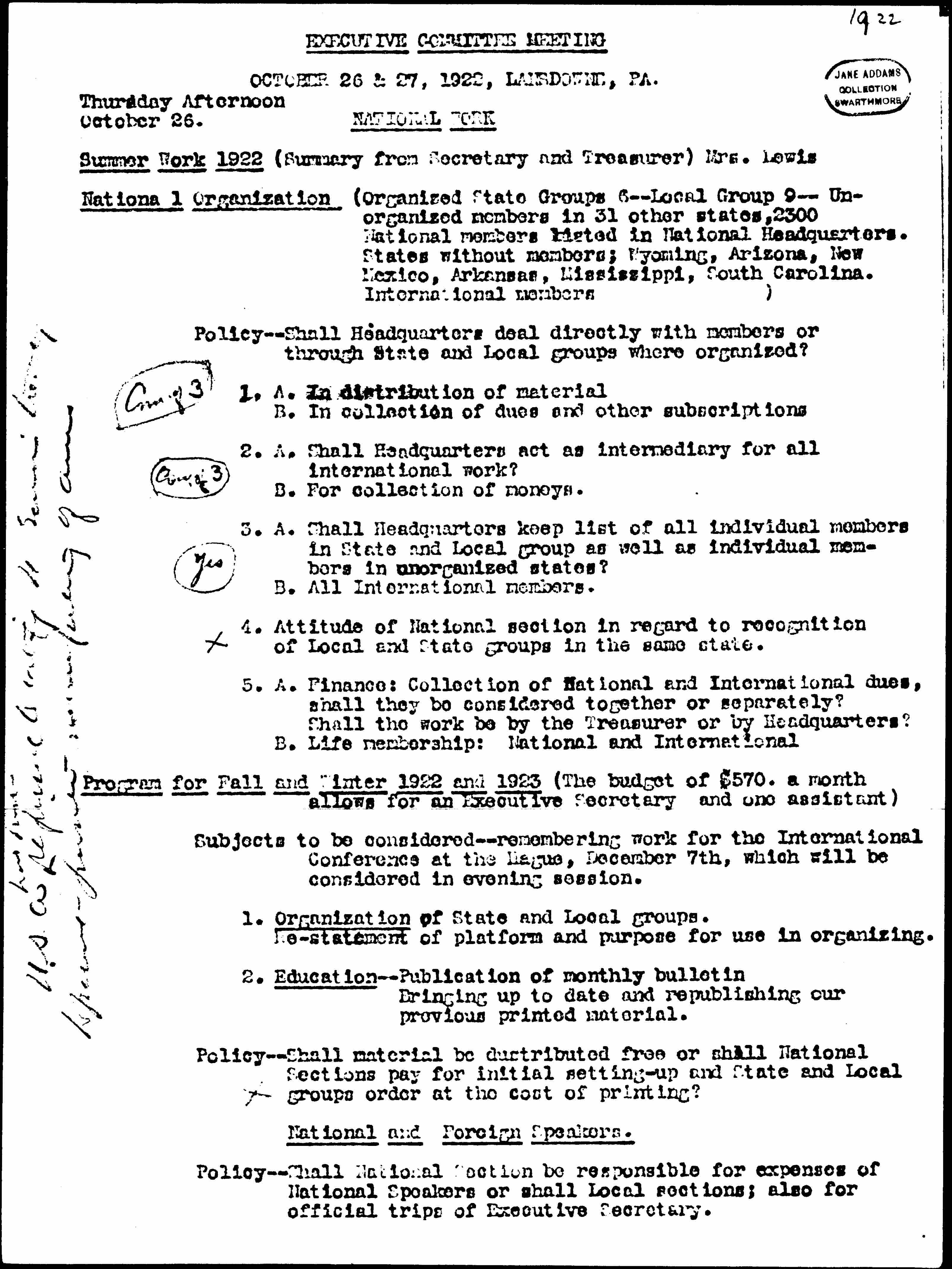 Program for Fall and Winter 1922 and 1923 (The budget of $570 a month allows for an Executive Secretary and one assistant)