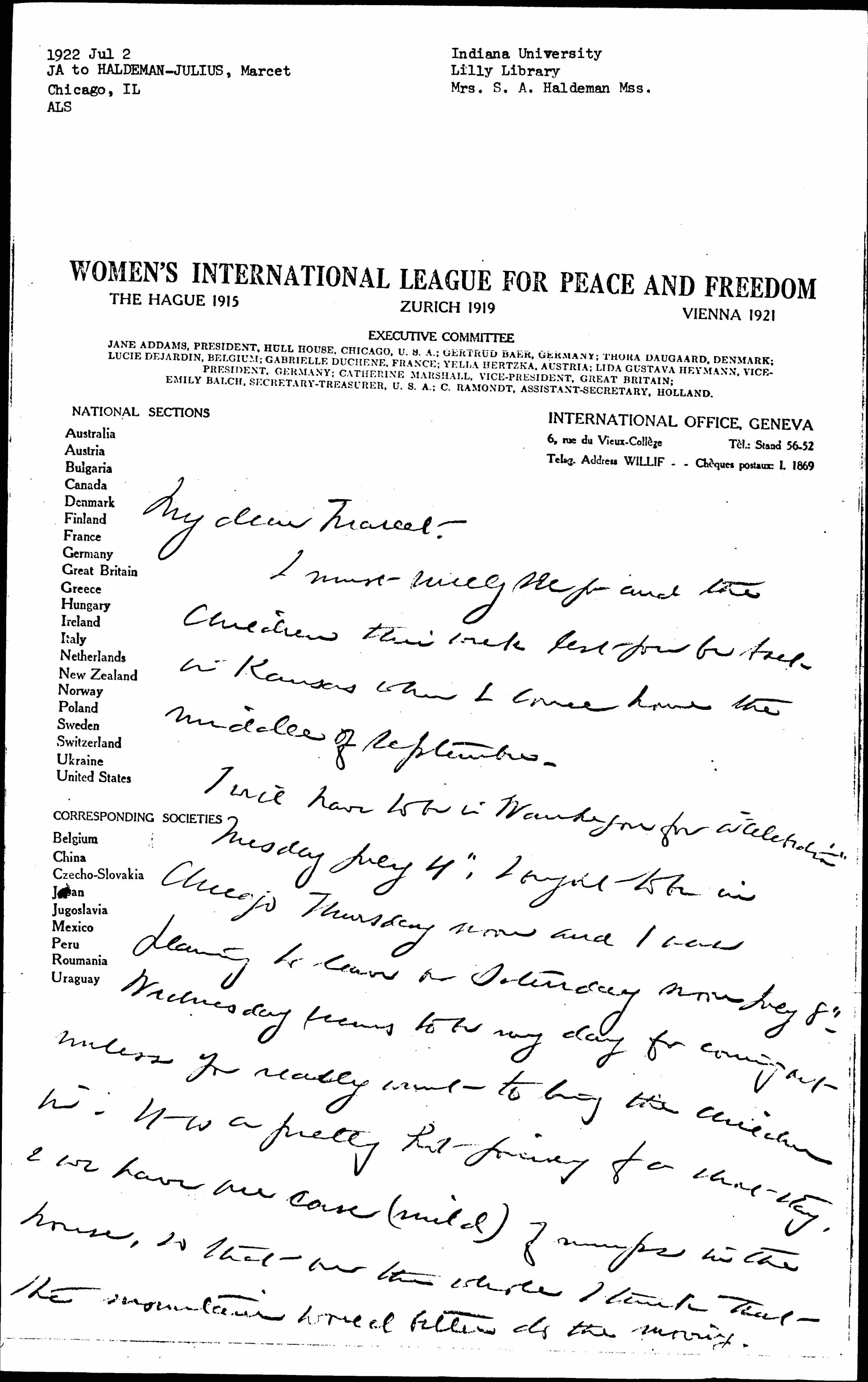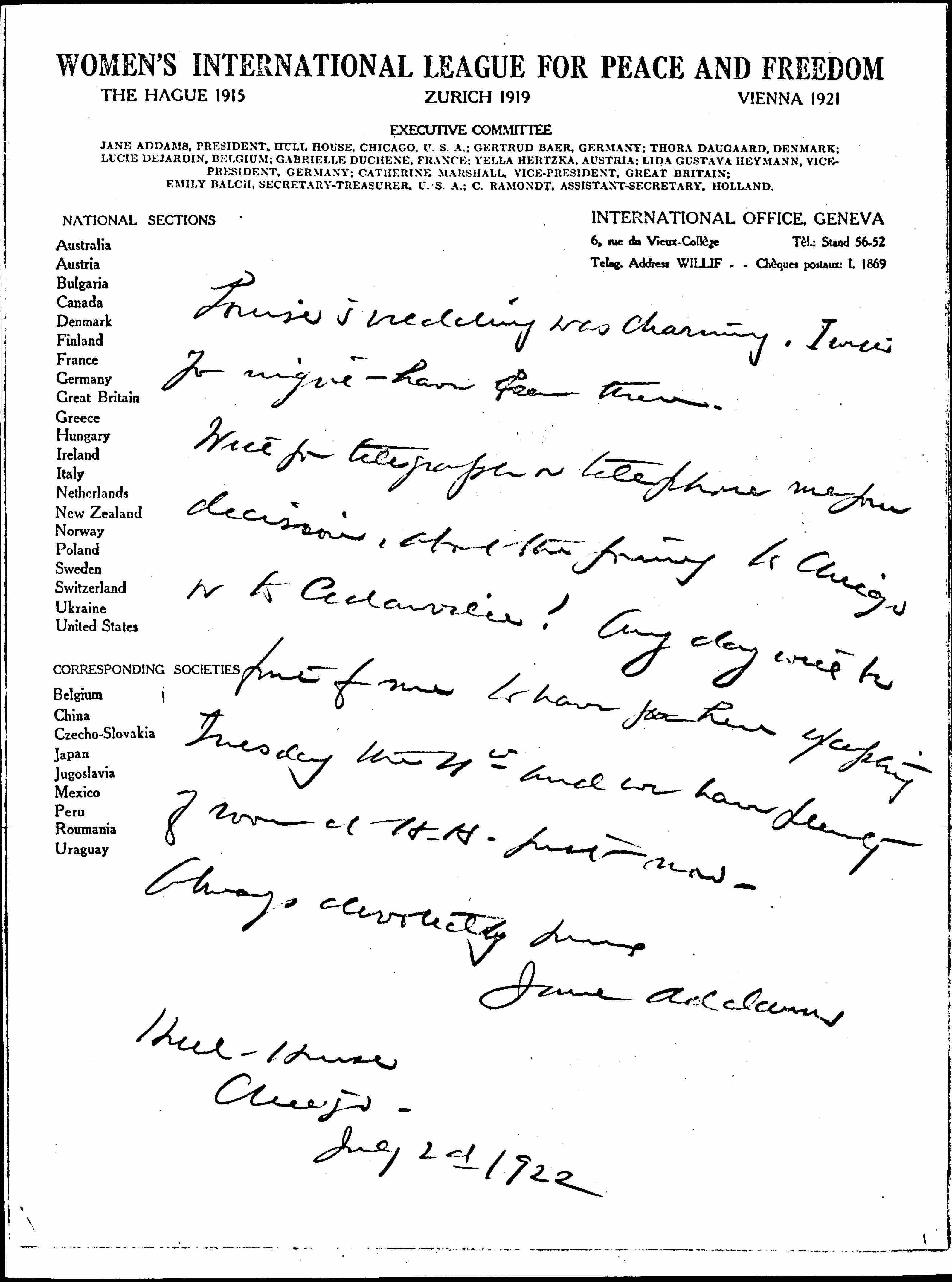 I will have to be in Washington for a "celebration" Tuesday July 4". I ought to be in Chicago Thursday noon and I was planning to leave on Saturday noon July 8". Wednesday seems to be my day for coming out unless you really want to bring the children in. It is a pretty hot journey for a short stay, & we have one case (mild) of mumps in the house, so that on the whole I think that the mountain would better do the moving. [page 2] Louise's wedding was charming. I wish you might have been there.