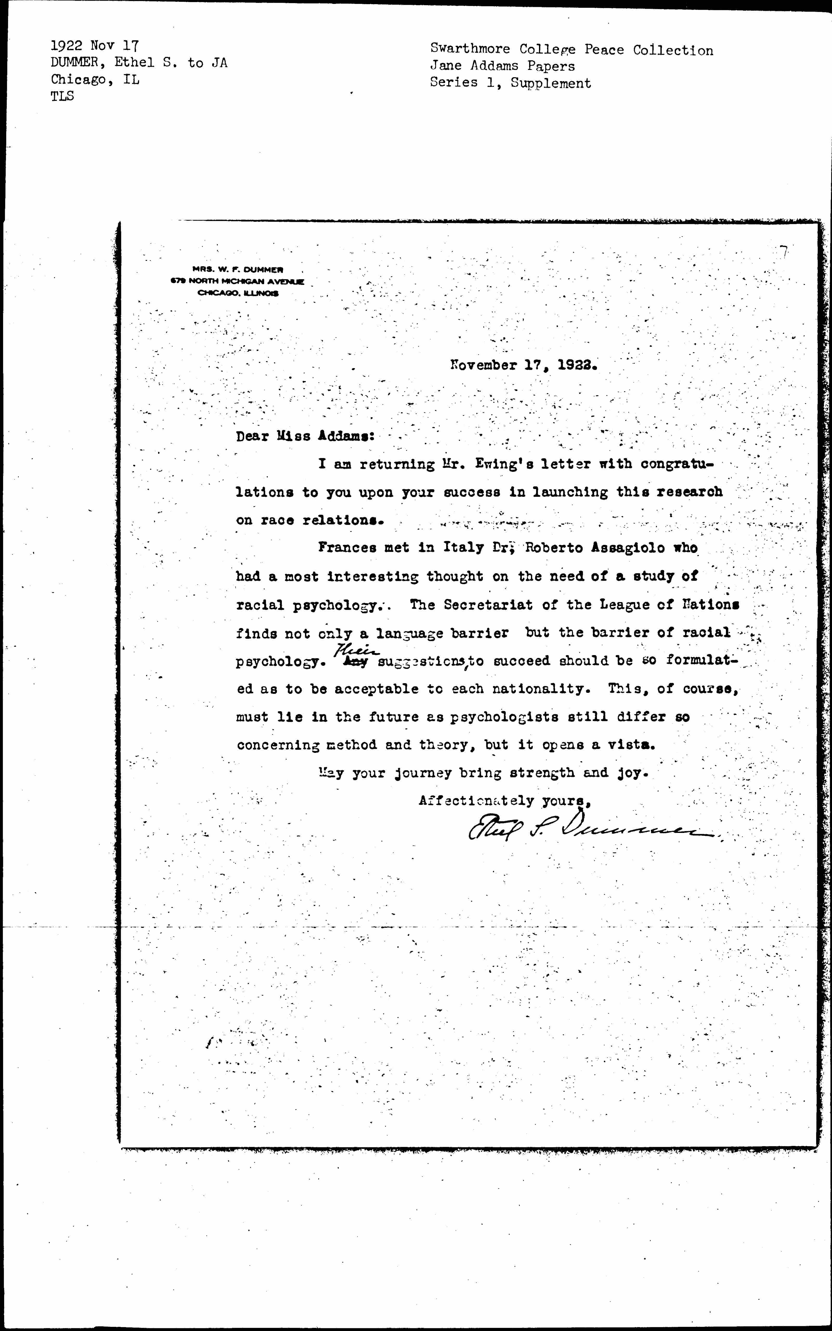 Frances met in Italy Dr. Roberto Assagiolo who had a most interesting thought on the need of a study of racial psychology. The Secretariat of the League of Nations finds not only a language barrier but the barrier of racial psychology. Any ↑Their↓ suggestions, to succeed should be so formulated as to be acceptable to each nationality. This, of course, must lie in the future as psychologists still differ so concerning method and theory, but it opens a vista.