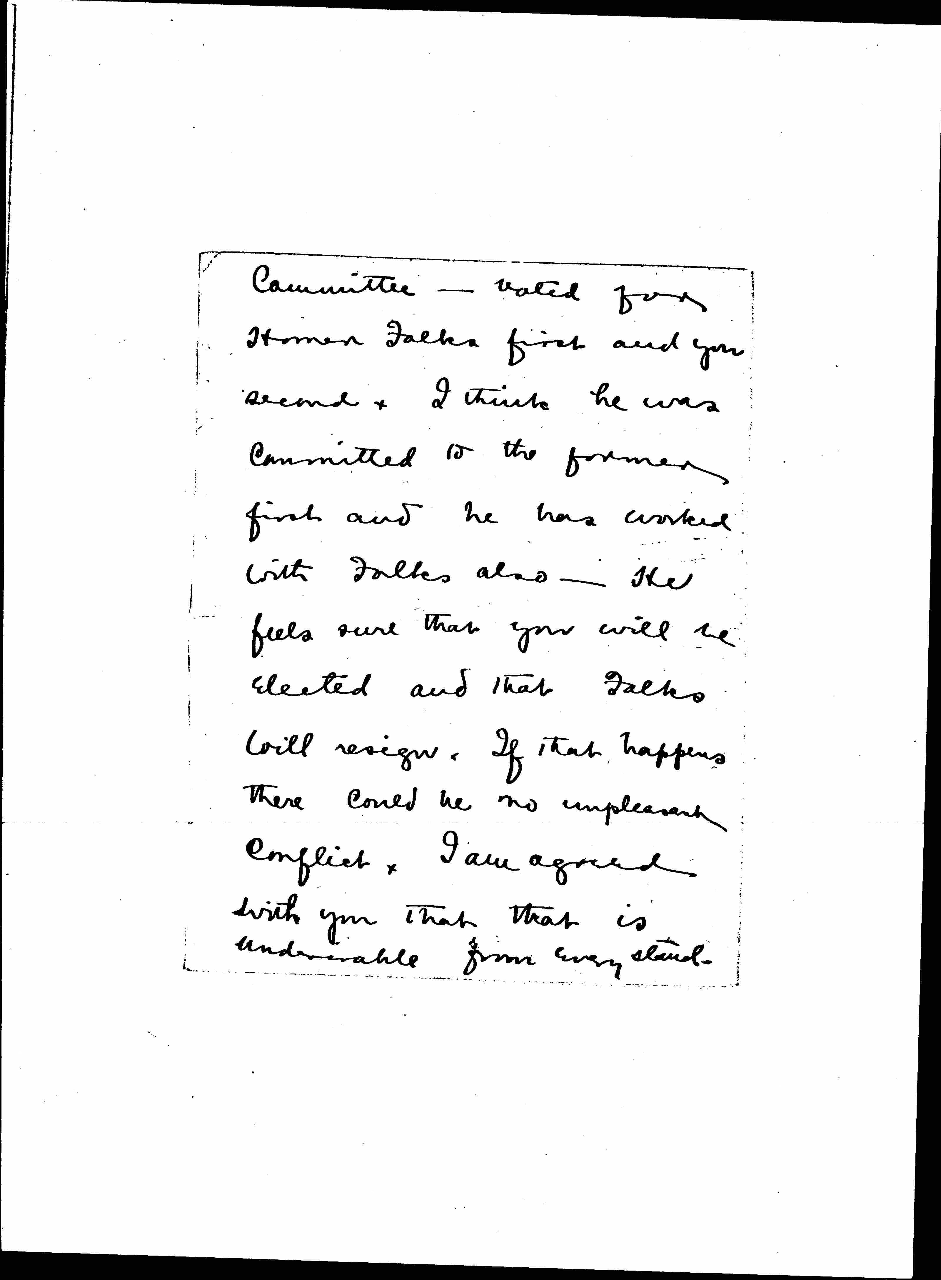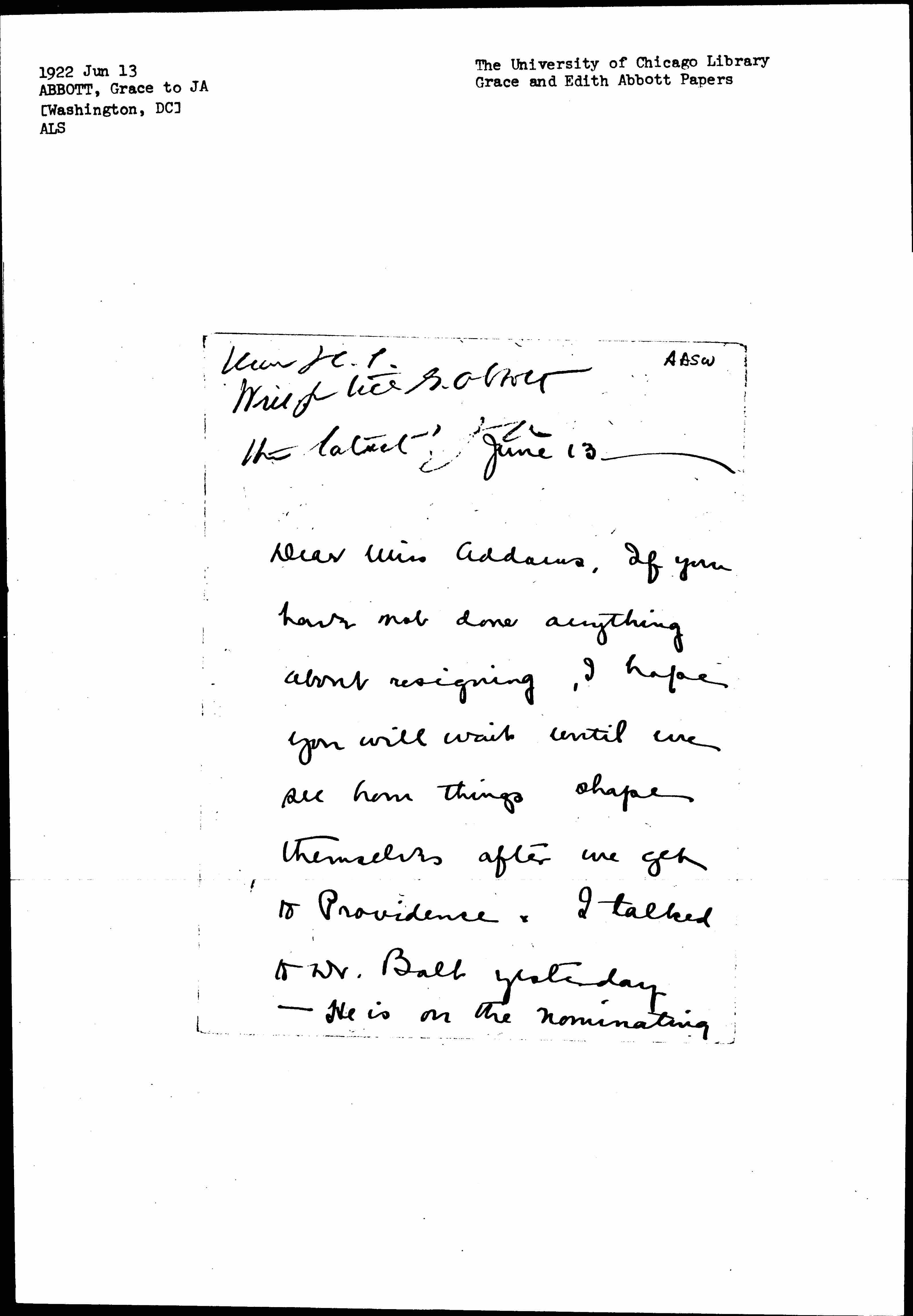 Dear Miss Addams, If you have not done anything about resigning, I hope you will wait until we see how things shape themselves after we get to Providence. I talked with Dr. Ball yesterday -- He is on the nominating [page 2] committee -- voted for Homer Folks first and you second. I think he was committed to the former first and he has worked with Folks also. He feels that you will be elected and that Folks will resign. If that happens there could be no unpleasant conflict. I am agreed with you that that is undesirable from every stand-point [page 3] and I should want you to resign or decline to run if we find that there is to be any.